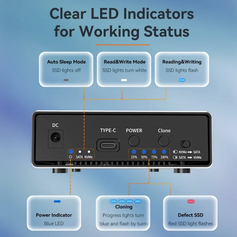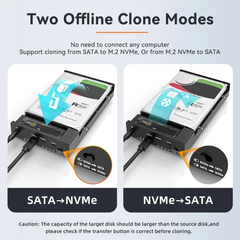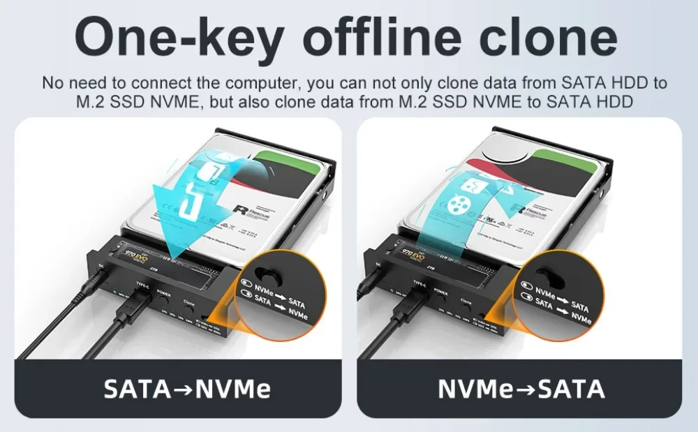 【Dos modos de clonación sin conexión】Soporta clonación SATA de 2,5/3,5 "a M.2 NVMe y clonación SATA de M.2 NVMe a 2,5/3,5", satisface sus diferentes necesidades.