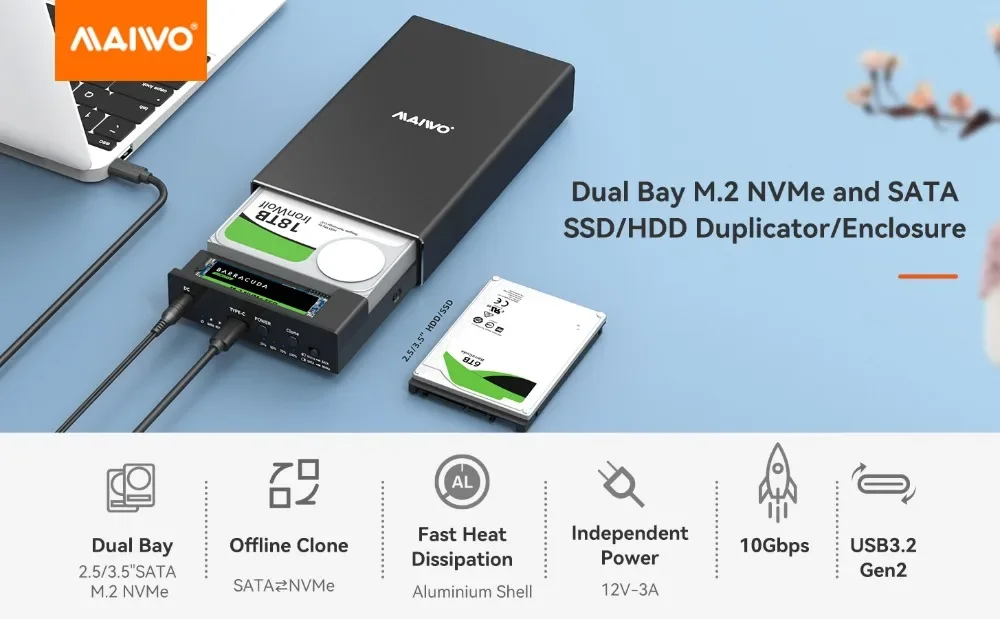 Comprar MAIWO-estación de acoplamiento M.2 NVMe 2,5, 3,5 pulgadas, SATA, SSD/HDD, clon sin conexión, caja de expansión de capacidad máxima de 10Gbps y 22TB