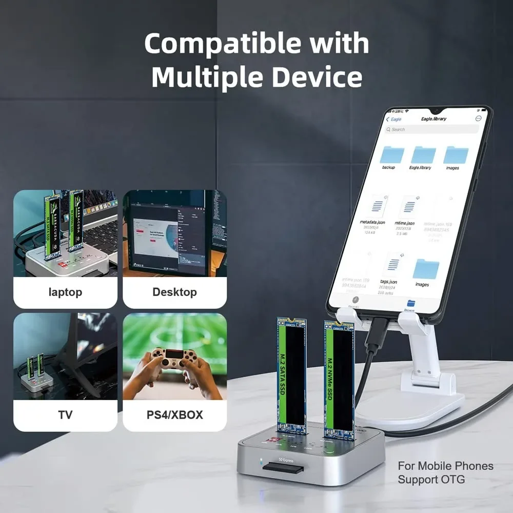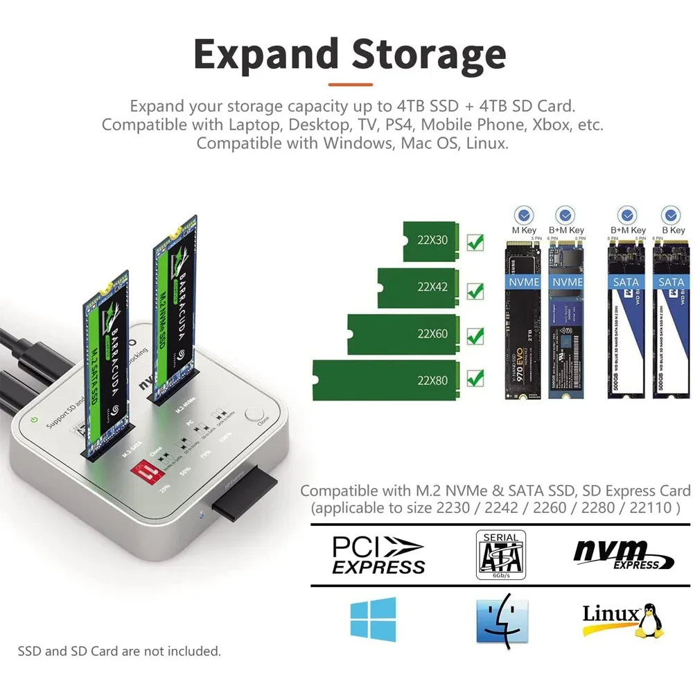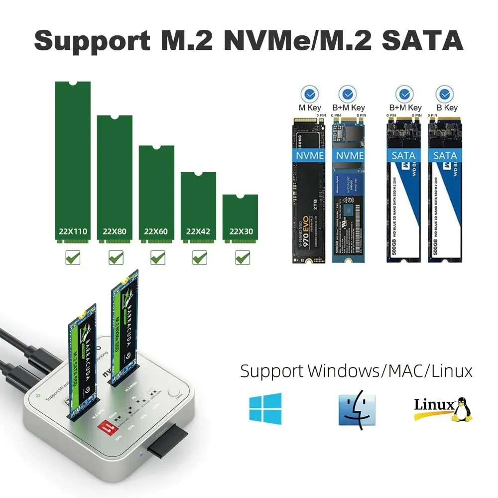 【Compatibilidad】 Esta estación de acoplamiento SSD M.2 de doble Bahía admite lectura, escritura y clonación de SSD M.2 NVMe/SATA (tamaño 2230/2242/2260/2280/22110). Y también leer y escribir tarjeta SD/SD Express 7,0/7,1