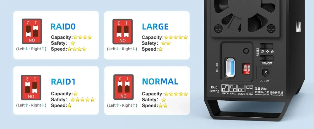 【4 modos Raid】La carcasa del disco duro sata tiene 4 modos Raid (tenura 0,1, JBOD (grande), normal), sin importar si desea realizar una copia de seguridad de sus datos, transferir datos rápidamente, leer y escribir dos HDD al mismo tiempo o ampliar Su capacidad de almacenamiento, conveniente para sus datos de procesamiento.