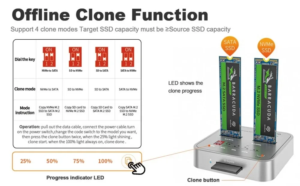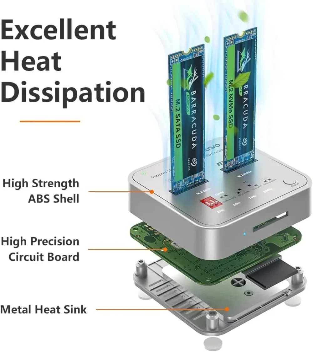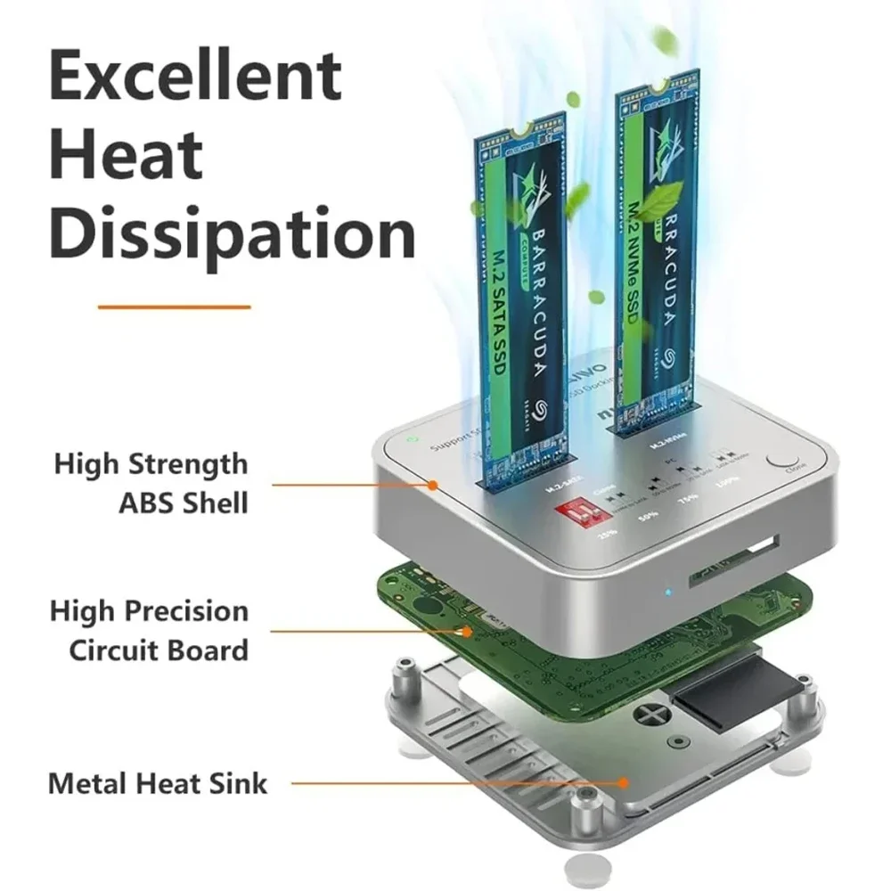Compatibilidad: esta estación de acoplamiento SSD M.2 de doble bahía admite lectura, escritura y clonación de SSD M.2 NVMe/SATA (tamaño 2230/2242/2260/2280/22110).Y también lea y escriba la tarjeta SD/SD Express 7.0/7.1