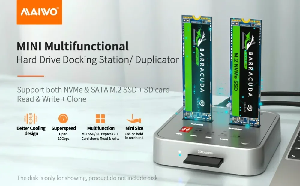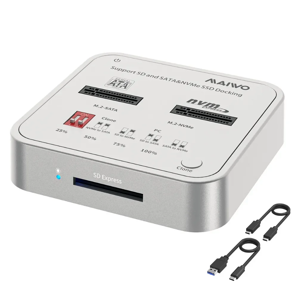 La base para disco duro de doble bahía MAIWO admite M.2 NVME, M.2 SATA (en tamaño 2230/2242/2260/2280/22110) y tarjeta SD/SD Express 7.0/7.1