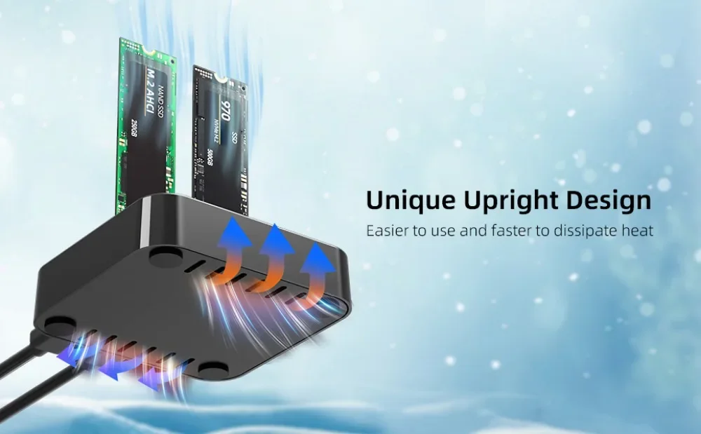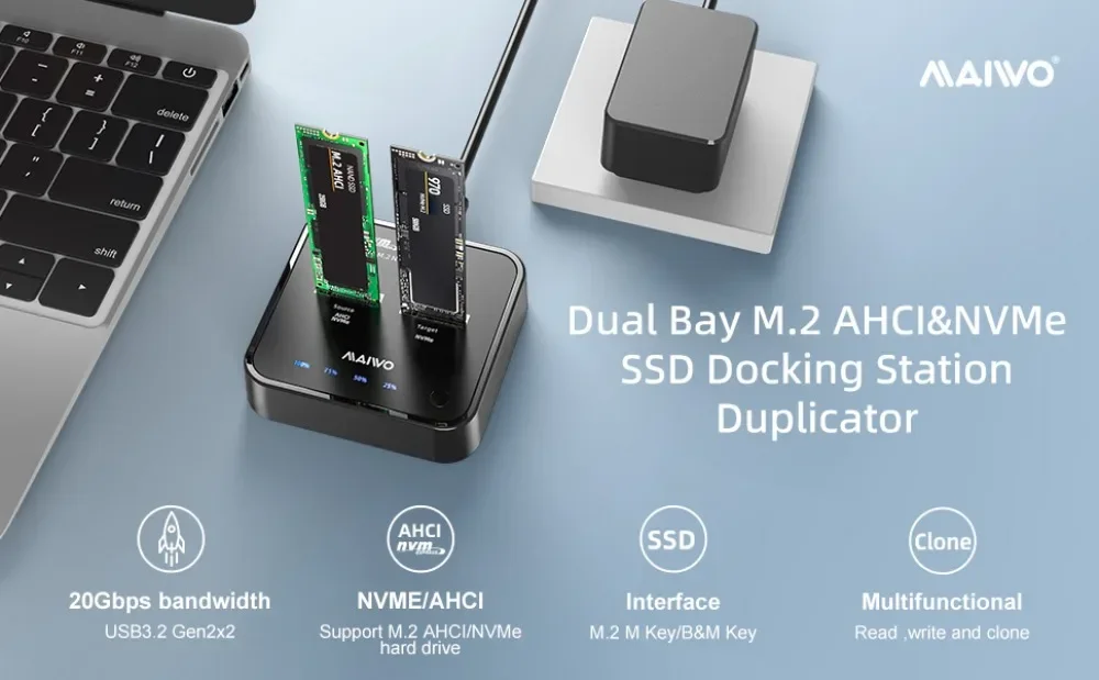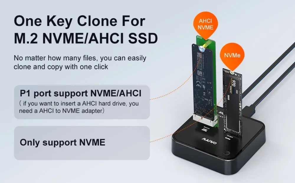 【One-key Clone】:The M.2 AHCI/NVME duplicator with one-key clone function, no need to connect computer, just plug two SSDs in and hooked up the power,click the 'clone' button for 5-8 seconds to quickly clone all files from 'SSD1' to 'SSD2', there are LED status indicators and the process completed quickly. NOTES: make sure the capacity of target M.2 NVME SSD larger than original M.2 SSD.