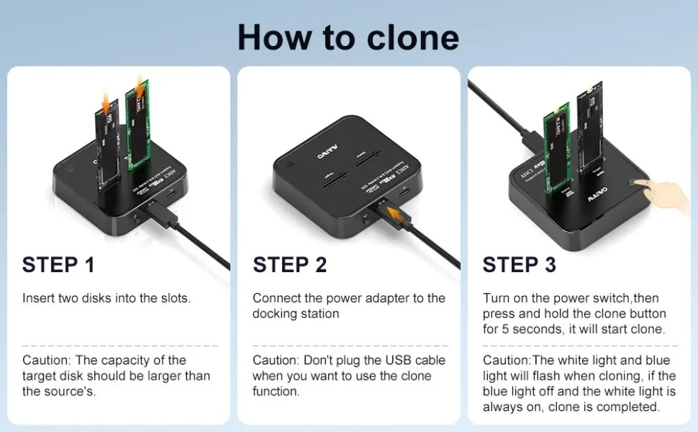 【No-slip pad+LED Indicator】:With silicone pad in the button, There is no more shaking when using.And there are LED indicator light, you can know the hard drive work status from clone LED indicator, you can know the progress when cloning.