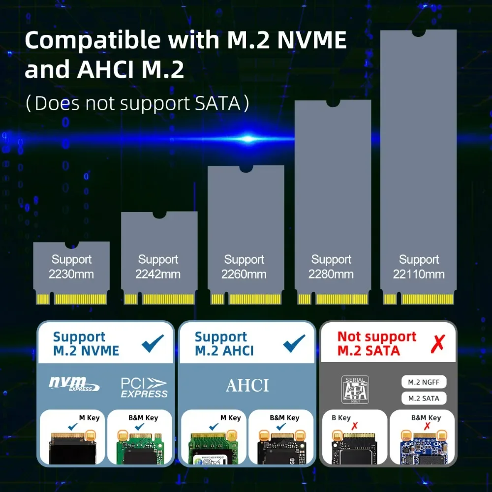 【Compatible with M.2 AHCI/NVME SSD】:The M.2 hard drive docking station support M.2 SSD size 2230/2242/2260/2280/22110.It support to read and write your data/file inside your M.2 AHCI/NVMe SSD.