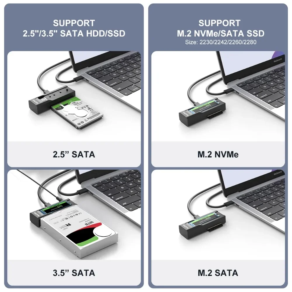 Compatible con diferentes tipos de HDD/SSD en el mercado, incluyendo M-key NVMe SSD,B + M key SATA M2 SSD, 2,5 "SATA HDD/SSD