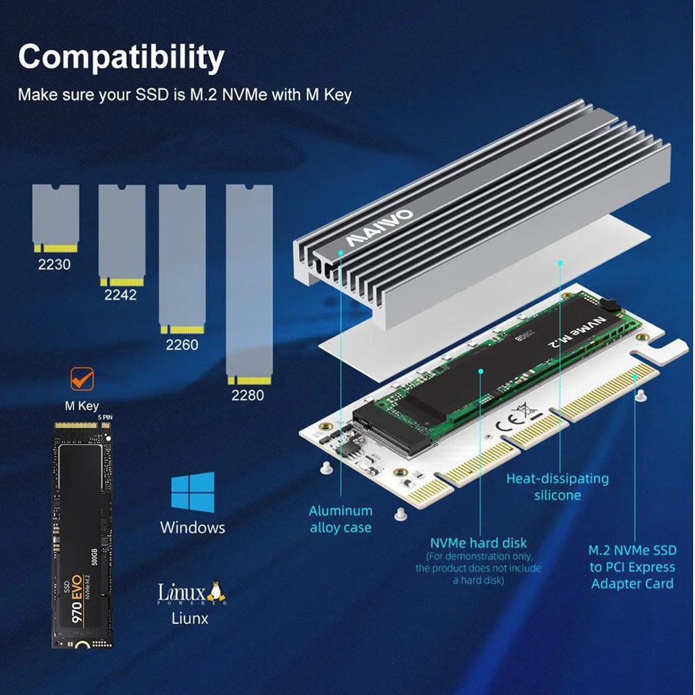Comprar MAIWO-tarjeta de expansión M.2 NVME SSD, convertidor de aluminio a PCIe X4, X8, X16 para M.2 NVMe 2230, 2242, 2260, 2280