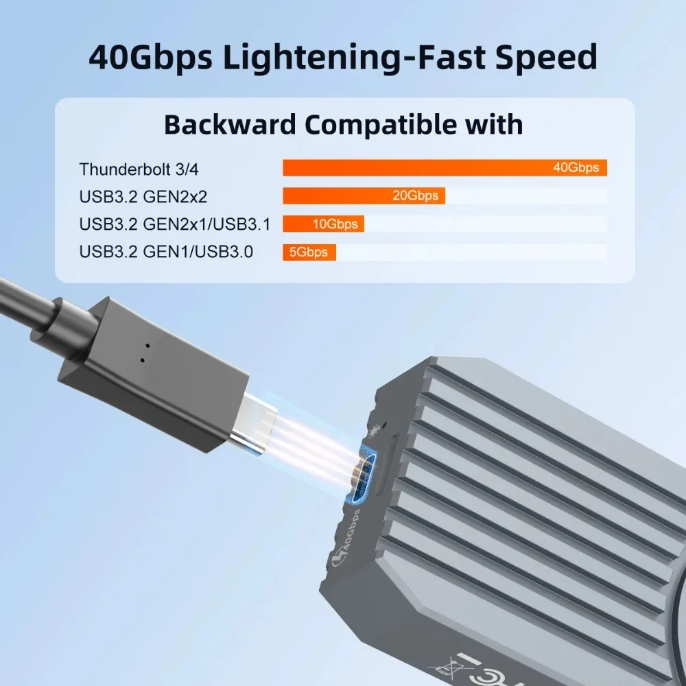 4.Interfaz USB 4.0 tipo C: con una interfaz USB 4.0 tipo C, este gabinete logra velocidades de transferencia de datos ultrarrápidas de hasta 40 Gbps, lo que permite una transferencia perfecta de 3000 MB/s en solo un segundo.