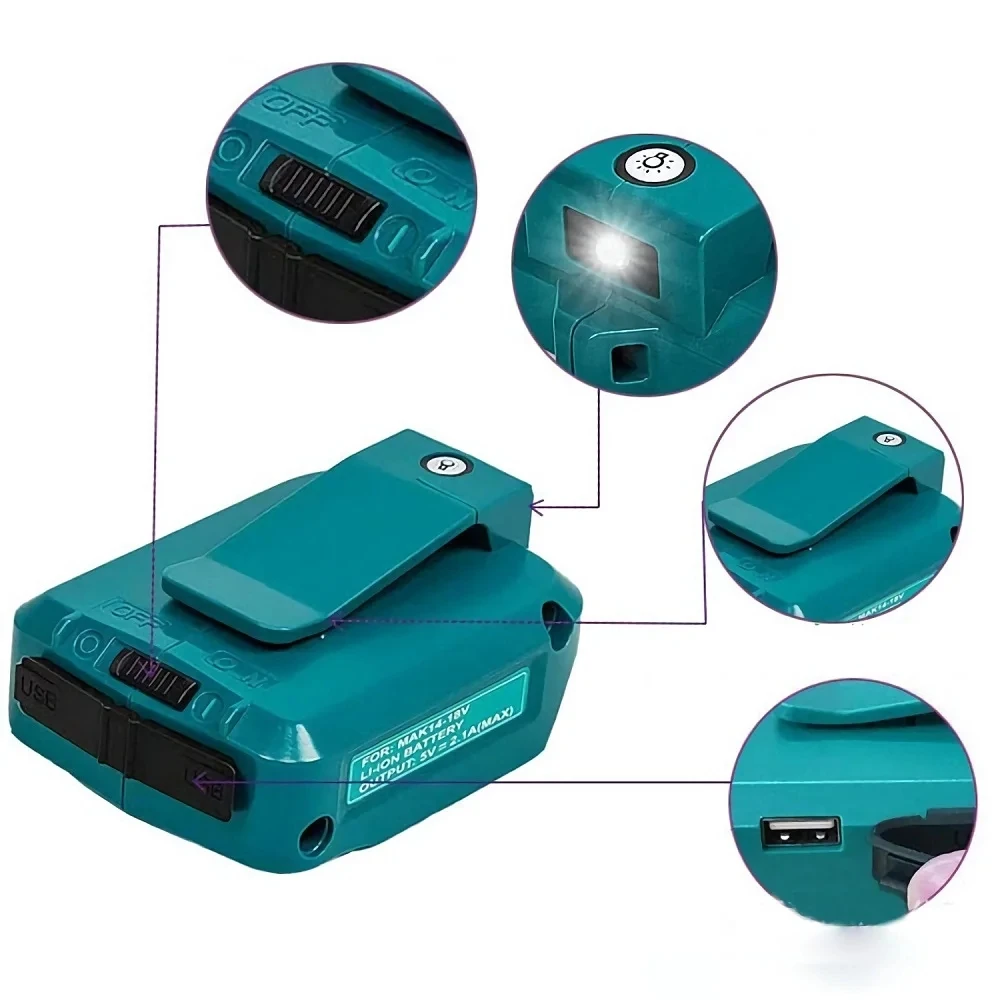 Comprar Para Makita 14,4 V/18V Lion batería puerto convertidor USB Dual con foco de luz LED linterna exterior para baterías Makita