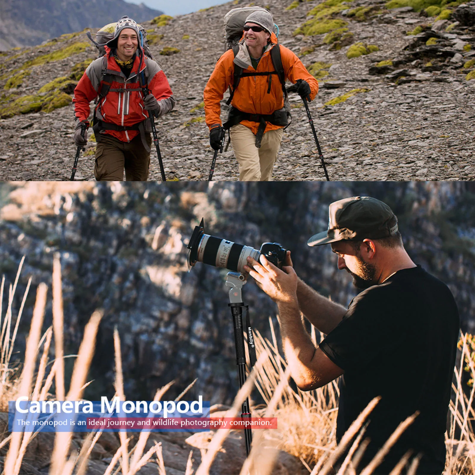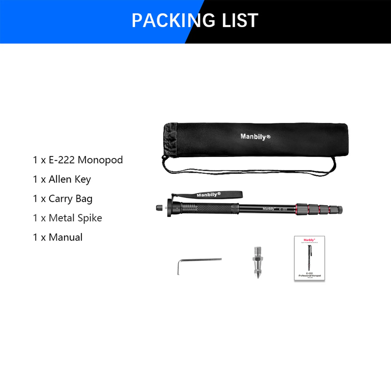 TRAVEL MONOPOD: The Manbily E-222 camera monopod is a 5-section aluminum alloy monopod and walking stick combination that rises to a maximum height of 65;, folds down to 19.7;, and weighs only 0.93 lb.