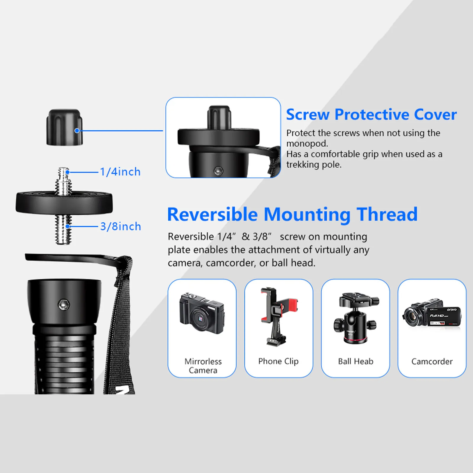 MORDEN AND FUNCTIONALITY: The portable monopod is designed with interchangeable rubber feet and metal feet. Comes with a protective screw cover and a carrying bag. So the monopod is an ideal journey, sports, and wildlife photography companion – compact and lightweight.