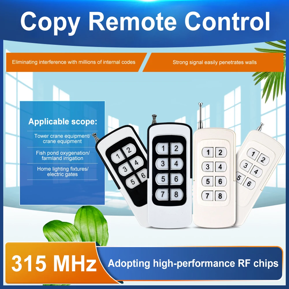2. Amplia compatibilidad:Nuestro duplicador de control remoto es ideal para grúas torre, grúas aéreas, aireadores de estanques, sistemas de riego agrícola, iluminación doméstica, Puertas Eléctricas y más. Nuestro control remoto de copia inteligente se puede utilizar en diversos entornos, proporcionando comodidad en diferentes industrias.