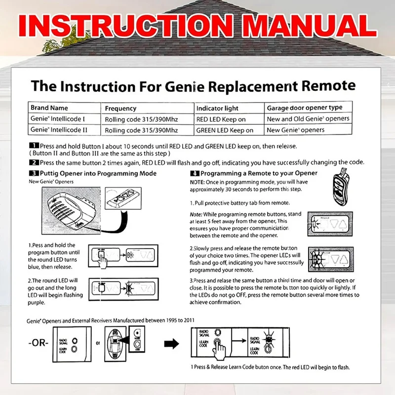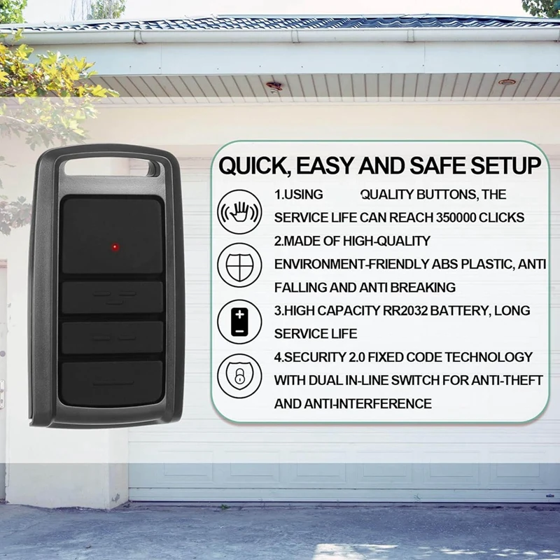 Embalaje incluido: cada compra viene con 3 controles remotos de puerta con pilas de botón que garantizan una larga vida útil, lo que garantiza que siempre esté en control;Además, el embalaje incluye un clip para visera y un manual de usuario de bricolaje para garantizar una instalación y uso sin esfuerzo;Esta característica hace que nuestro control remoto para abrir puertas de garaje sea una opción perfecta para todos los propietarios de viviendas.