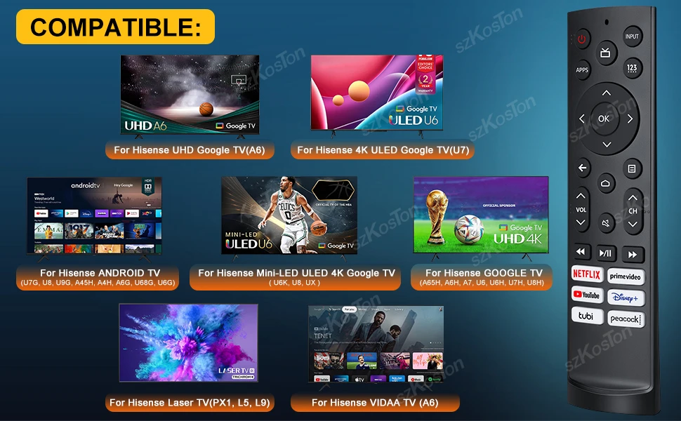 【Modelos de TV compatibles】Control remoto de repuesto ERF3A90 para Hisense ANDROID TV(series U7G, U8, U9G, A45H, A4H, A6G, U68G, U6G), para Hisense Laser TV(series PX1, L5, l9), para Hisense UHD Google TV(serie A6), para Hisense GOOGLE TV(serie A65H, A6H, A7, U6, U6H, U7H, U8H), para Hisense 4K ULED Google TV(serie U7), para Hisense Mini-LED ULED 4K Google TV(serie U6K, U8, UX), para Hisense VIDAA TV(serie A6).