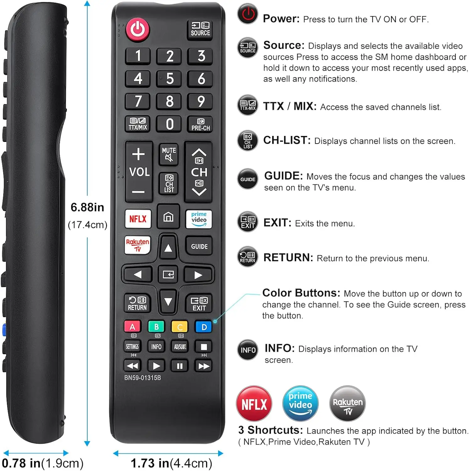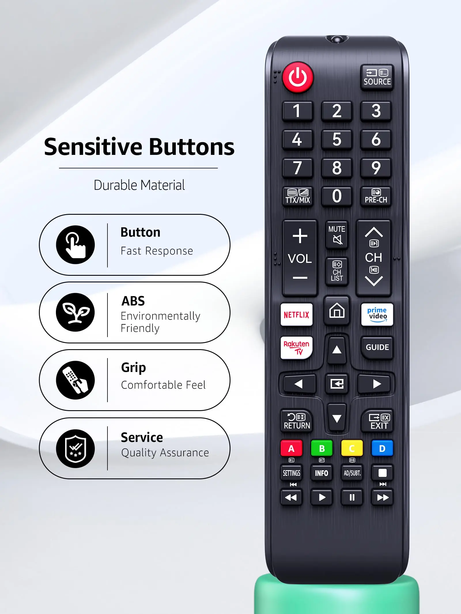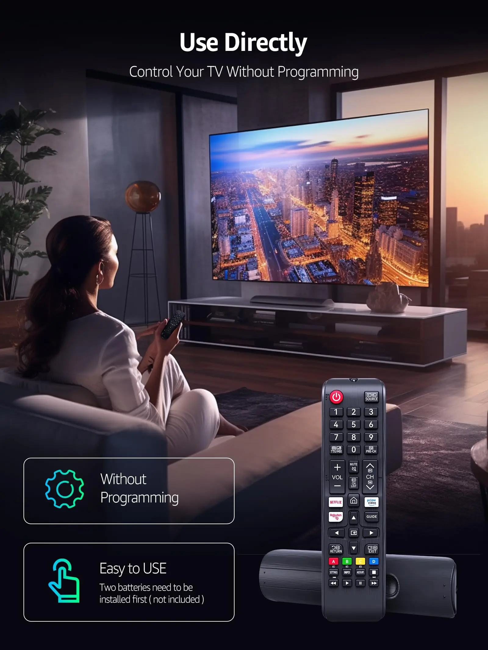 ✔️✔️【No requiere configuración】El diseño liviano y ergonómico hace que este control remoto sea fácil de agarrar y difícil de deslizar.No se requiere programación ni configuración.Simplemente inserte las baterías y use el control remoto de reemplazo del televisor Samsung.NOTA: No se incluyen 2 pilas AA.