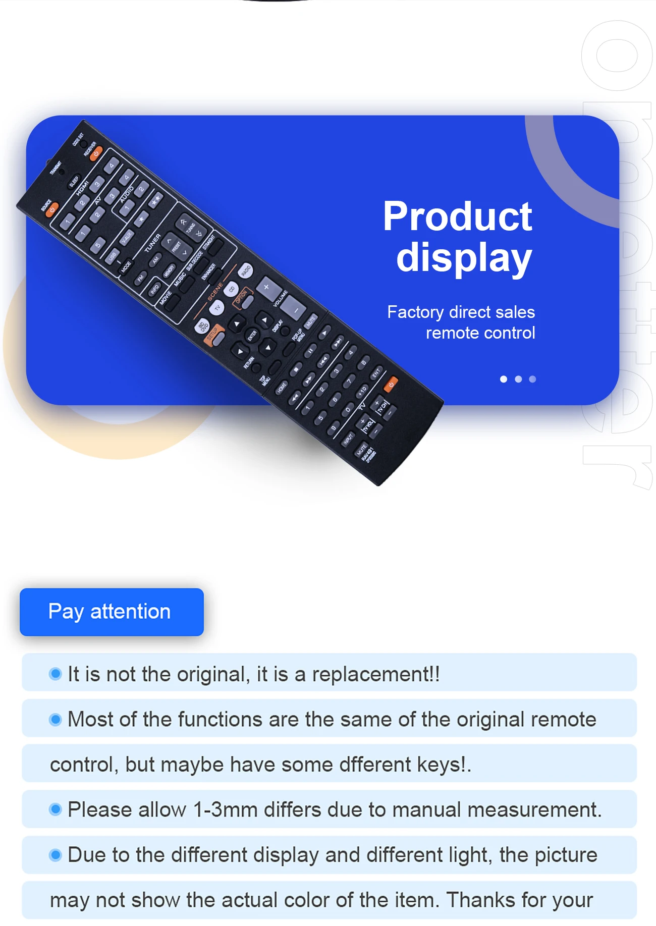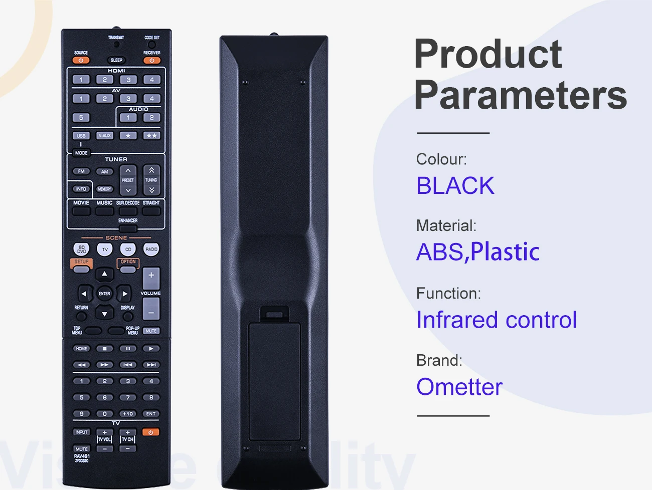 - Control remoto IR para reproductores de audio/video YAMAHA【Modelo del producto】 RAV491 ZF30320 RAV494【Adecuado para el modelo de equipamiento】 RAV521 RXV377 RXV377BLESPECIFICACIÓN:【Tipo】Control remoto IR para reproductores de audio/video YAMAHA【Marca】OMETTER【Material】Plástico, ABSAsegúrese de que este es el control remoto correcto antes de realizar el pedido. Gracias ~No se necesita ningún programa, solo poner una batería nueva funcionará bien.Contenido del paquete: 1 mando a distancia (pilas no incluidas).Damos la bienvenida a los compradores a granel (pidan 10 o más cada vez), contáctenos para obtener el precio de descuento de compra a granel.Servicio postventa:Después de recibir el artículo, si tiene algún problema con los productos, no dude en contactarnos, haremos todo lo posible para ayudarlo a resolver el problema.Si no recibe su artículo en 50 días, háganoslo saber y le reembolsaremos todo su pago. O reenvío para ustedNuestro principio de servicio es permitir que cada cliente tenga una buena experiencia de compra.Comentarios:Nuestro objetivo es su satisfacción con la experiencia de compra.Para cualquier pregunta, no dude en ponerse en contacto con nosotros antes de dejar comentarios, le ayudaremos a resolverla, Gracias :)Gracias por su interés. ¡Buena compra!