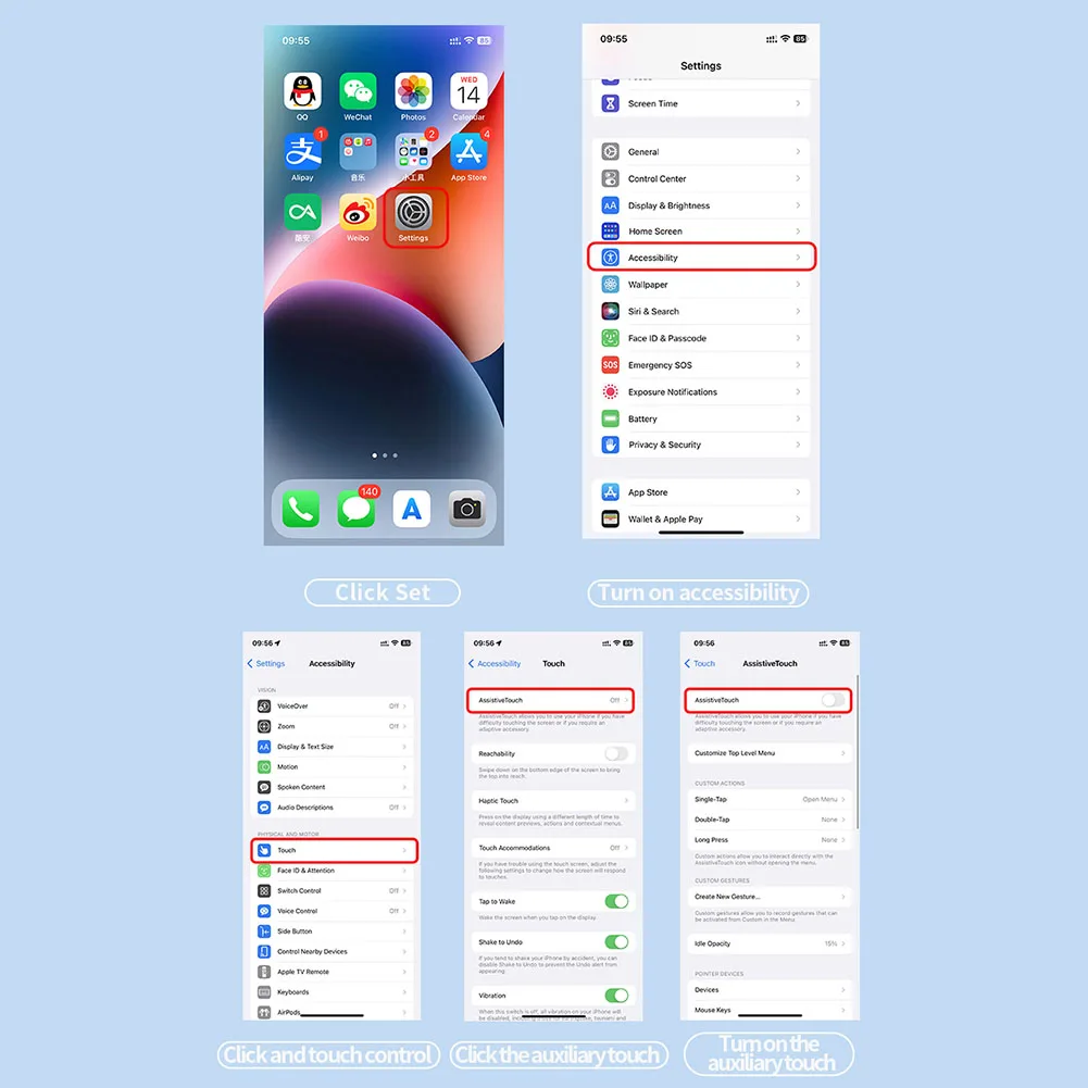 Los teléfonos móviles/tabletas de Apple para iPhone y iPad (para usuarios del sistema iOS) deben activar la función táctil auxiliar, ir a (Configuración-Accesibilidad-Touch-Assistive Touch-On) y ajustar la sensibilidad de seguimiento al 10% -50% en esta página;