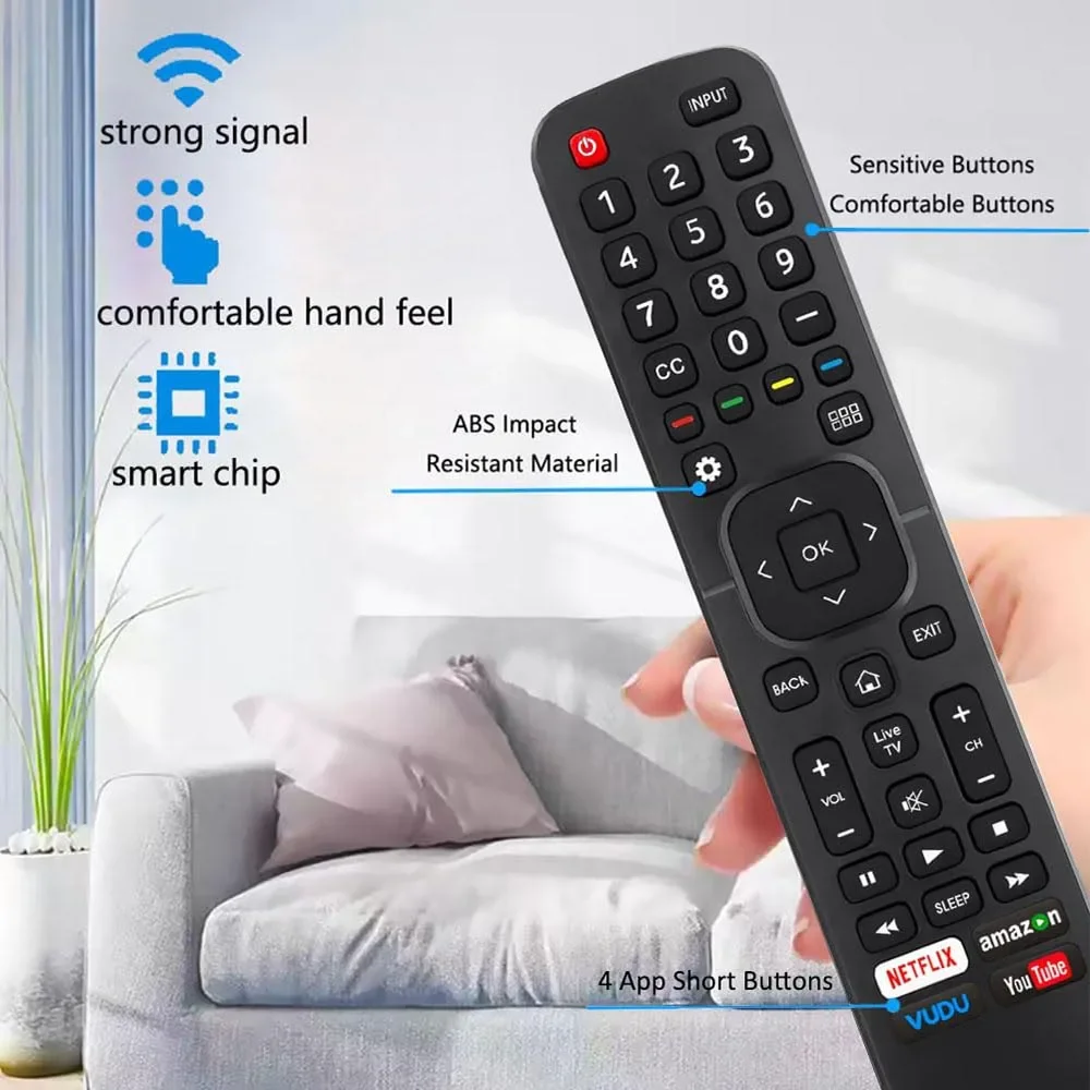 1.Control remoto universal compatible con todos los televisores inteligentes Hisense 4K ULED HD UHD Android.Tenga en cuenta: NO funciona para Hisense fire ni Roku TV.2.El reemplazo perfecto para su control remoto original, con la misma función y material que el original.Cuando obtenga nuestro control remoto, ya no es necesario emparejarlo ni programarlo, simplemente inserte 2 pilas AAA para usar (pilas no incluidas)3.Compatible con todos los modelos de control remoto de TV Hisense: EN2A27 EN2A127H EN2A27HT EN2AN27H EN2AS27H EN2B27 EN2C27 EN2D27 EN2G27 EN33922A EN33924HS EN33925A EN33926A EN33927A EN2BN27H ERF2A60 y más4. Un control remoto de TV universal para Hisense TV con 4 atajos de inicio rápido: Netflix, Amazon, VUDU y YouTube