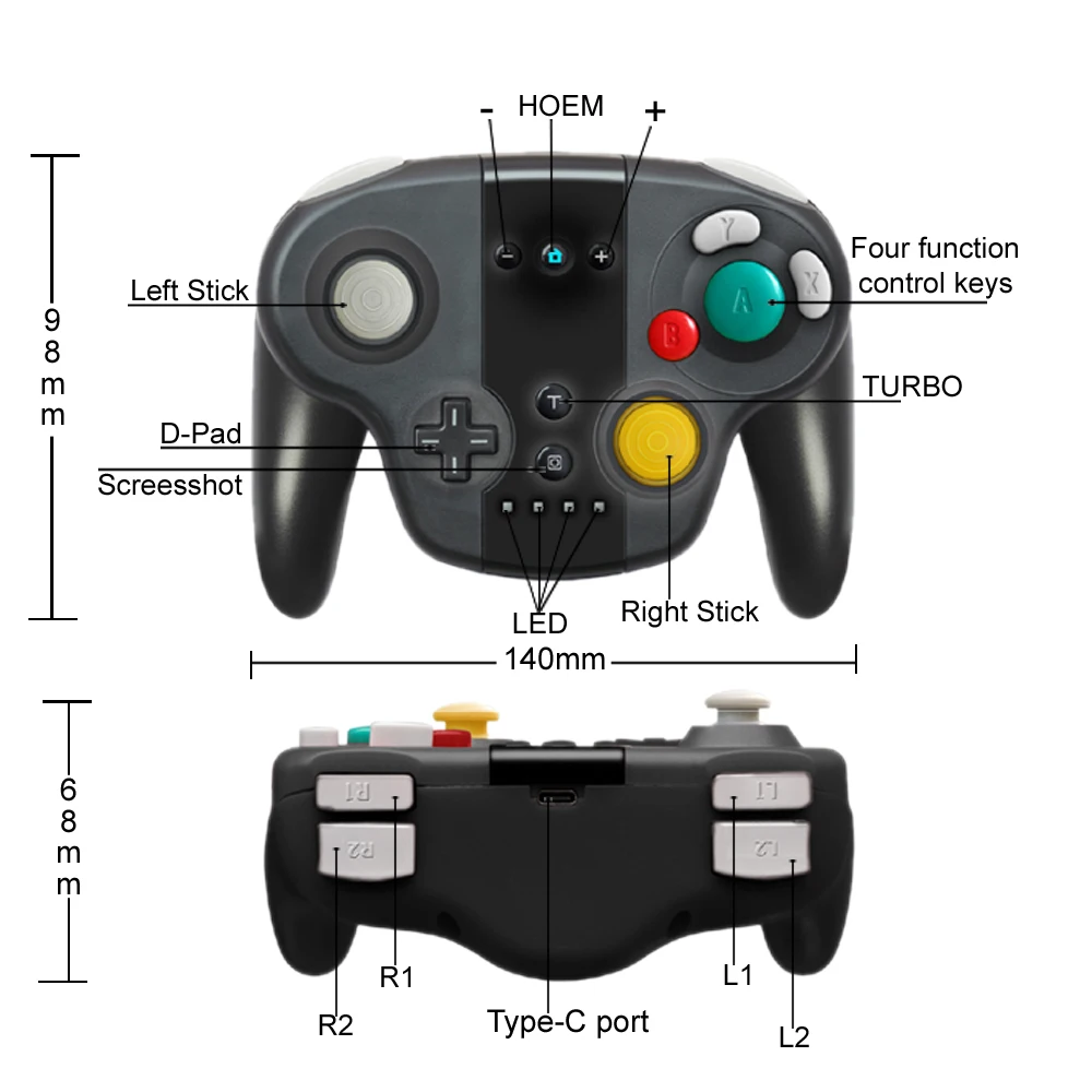 - Instrucciones de conexión1) Conexión inalámbrica a la consola SwitchA. Conexión a una consola Switch por primera vez:Encienda una consola Switch, en la interfaz principal de la consola, haga clic (con el dedo) en "Controladores" → "Cambiar agarre/orden" para pasar a la interfaz de modo de emparejamiento; presione la tecla "HOME" y manténgalo presionado para que el controlador se encienda, los cuatro LED en el controlador comienzan a parpadear lenta y circularmente y luego parpadean rápidamente y circularmente después de la 4S. Cuando uno (o más) de los cuatro LED es brillante, significa que el controlador está emparejado con la consola con éxito; presione la tecla "B" para volver a la interfaz principal de la consola.B. Conexión a una consola Switch emparejada:Si un controlador se emparejó con una consola Switch antes, simplemente presione la tecla "HOME" brevemente para encender el controlador, el controlador se conectará a la consola automáticamente nuevamente.C. Conexión del controlador a la consola Switch:A. Si un mando está en modo de suspensión, pulse brevemente la tecla "INICIO" para activarlo, se conectará a la consola de nuevo automáticamente.B. Si una consola Switch está en modo de suspensión, primero presione el botón de encendido de la consola para encenderla y luego presione brevemente la tecla "HOME" del controlador para volver a conectarla a la consola (si una consola Switch está en modo de suspensión, La consola no se puede activar presionando directamente cualquier tecla del controlador).2) Conexión a la consola del interruptor a través del cable USBEn la interfaz principal de una consola Switch, haga clic en "Configuración" → "Controladores y sensores" → "Comunicación por cable del controlador Pro" → "ENCENDIDO" para abrir la conexión por cable del controlador Pro; conecte un controlador al puerto USB del soporte de la consola a través de un cable USB, El LED 4 en el controlador comienza a parpadear lentamente y luego el LED 1 en el controlador parpadeará lentamente después de que el controlador esté conectado a la consola.Nota: Instrucción de la función NFCPrimero abra la opción amiibo en la configuración del sistema de una consola Switch; seleccione amiibo en la habilidad especial en un juego; opere de acuerdo con los Consejos correspondientes en el juego; coloque la tarjeta NFC cerca del centro de este controlador, se detectarán los accesorios de juego correspondientes.3) Conexión a PC con Windows a través de un cable USBAl principio, se requiere descargar e instalar el controlador en un PC con Windows; conecte un controlador al PC con Windows a través de un cable USB. Cuatro LED en el controlador comienzan a parpadear lentamente, luego el LED 1 y el LED 4 parpadearán lentamente después de que el controlador del controlador se instale en el PC de forma automática y exitosa, El controlador está listo para su uso. Se admiten los juegos de modo de X-360. Se puede obtener el controlador de la de Internet.Nota: con función de vibración pero sin función de detección de movimiento en modo de conexión por cable de modo de X-360.