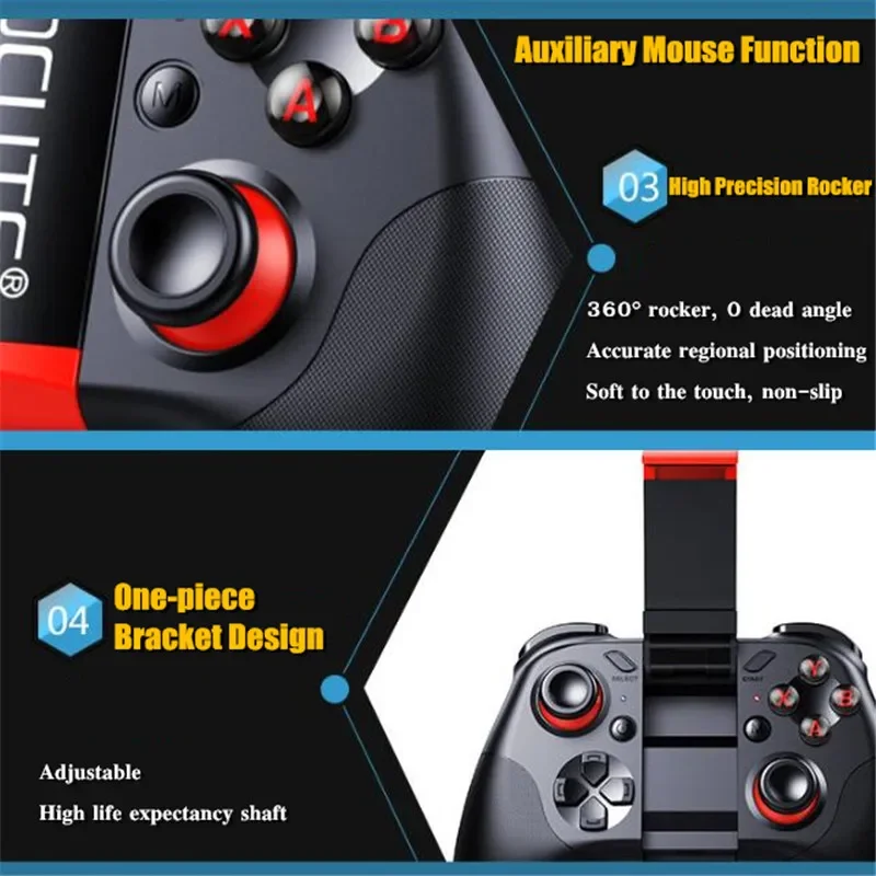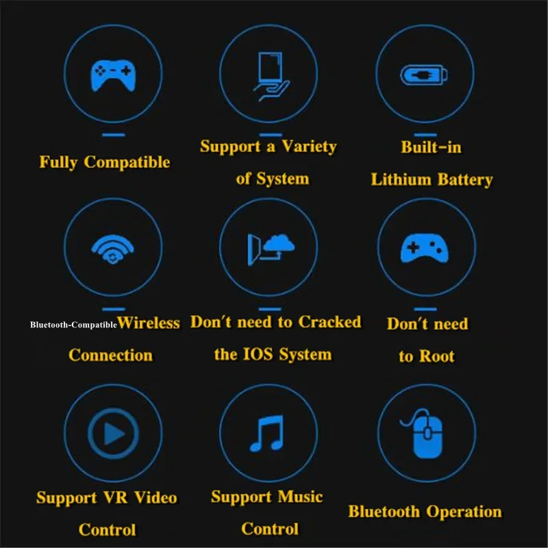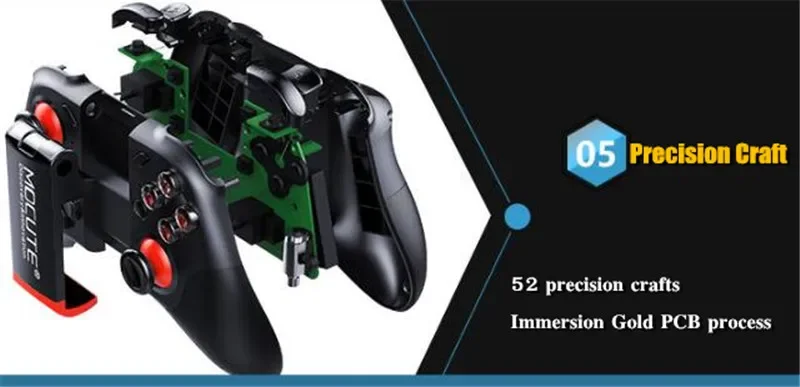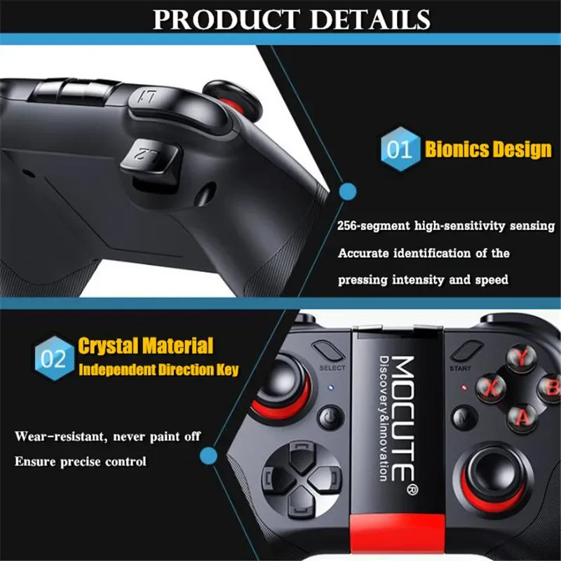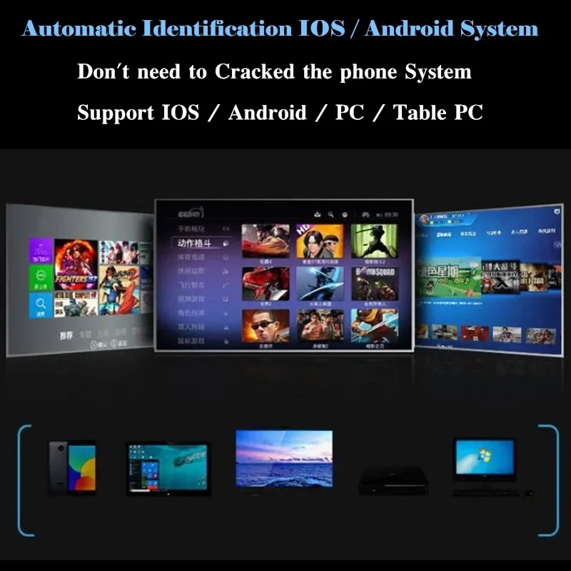 Totalmente compatible Admite una variedad de sistemas Batería de litio incorporada de gran capacidad de 400 mAh Conexión inalámbrica Compatible con Bluetooth, funcionamiento Compatible con Bluetooth No es necesario romper el sistema IOS No es necesario enraizar Admite control de vídeo VR Sistema IOS/Android de identificación automática Muchos juegos para que juegues Posicionamiento de alta precisión, cómodo y fácil de manejar. Modo de juego inmersivo, diseño biónico. Detección de alta sensibilidad de 256 segmentos Identificación precisa de la intensidad y velocidad de presión. Material de cristal, botón de dirección independiente Resistente al desgaste, nunca se pinta Garantizar un control preciso Rocker de alta precisión, posicionamiento regional preciso Suave al tacto, antideslizante. Función auxiliar del ratón Diseño de soporte de una sola pieza Eje de alta vida, ajustable. 52 artesanías de precisión Placa de circuito de inmersión en oro