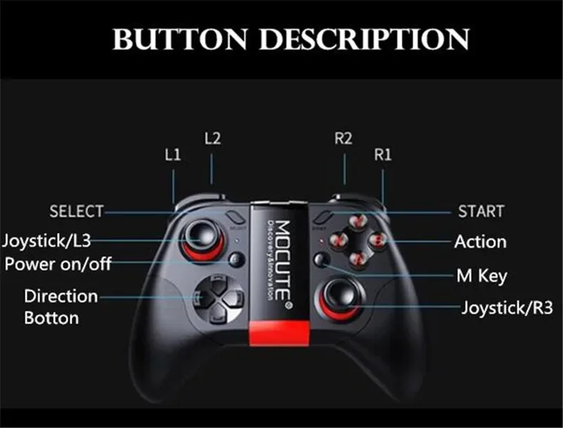 Mocute 054 Gamepad inalámbrico para teléfono móvil PC Android TV Box controlador Bluetooth gatillo almohadilla de juego móvil Joystick para juegos1.Dispositivo Android estándar (modo A)En el menú, si el joystick izquierdo puede mover el cursor, el botón A&X ingresa al botón, el botón B&Y regresa la tecla; Esto significa que su sistema móvil puede admitir gamepad estándar internacional, simplemente descargue el juego y juegue directamente.(Si no puede operar, consulte parte del funcionamiento móvil Android MTK)2.Descarga del juego:Escanee el código QR en el manual para ingresar al centro de descarga MIGAMEPAD, luego podrá descargar la aplicación de juego Newgame o Migamepad o la aplicación de juego de terceros.por ejemplo.Plataforma Newgame: después de ingresar a la aplicación Newgame, es necesario verificar la administración del menú-gamepad.Si la conexión se realiza correctamente, puedes jugar directamente en el centro Newgame.La clave m son las funciones clave del Newgame.Nota: La aplicación Newgame se conectará automáticamente al protocolo Newgame; si cambia a la operación de otra plataforma, presione el botón INICIO del teléfono y salga de la plataforma Newgame.El centro de juegos MIGAMEPAD tiene todos los juegos de gamepad y admite juegos NES/GB/GBC/SFC/SMD/GBA/N64/MAME/PS.Los usuarios también pueden descargar archivos BIN del simulador a la carpeta de archivos de juegos en el móvil, luego pueden usar el software MIGAMEPAD para abrir el archivo del juego, como muchos juegos famosos: Super Mario, Metal Slug Sangokushi, etc.3.Dispositivo Android MTK/PC (modo Y)Al igual que la versión Redmi 3G, Huawei Honor3X, CooIPAD, Zhongxing, etc., estos móviles de estilo antiguo utilizan CPU MTK, debido a la mala compatibilidad de MTK, no pueden admitir el acuerdo de gamepad estándar internacional.Entonces, si es mediante el método de conexión estándar de Android, se producirán problemas inusuales.Preestablecimos el modo MTK para admitir juegos MIGAMEPAD. En este modo, la salida de las letras del teclado se puede utilizar para configurar el juego en la función de PC.4. Modo Android/iOS VR (modo A)¡Con este modo solo para BaoFeng u otra aplicación de realidad virtual!A es el botón de ingreso, B es el botón de retorno, X es el botón de menú, el joystick izquierdo puede mover el cursor en el menú de la aplicación, cuando se reproduce videos con el joystick izquierdo, arriba es volumen+, abajo es volumen-, izquierda es rebobinado rápido, derecha es Avance rápido (Nota: en la aplicación i05 BaoFeng VR se debe configurar el gamepad es la opción MOCUTE).5.Para el modo ICade IOS (modo B)Ingrese a la tienda de aplicaciones u otra tienda de Apple, busque "iCade", luego podrá encontrar juegos de iCade que admitan gamepad, descargue e instale, luego estará bien. como Akane Lite, Brotherhood, TTR Premium, etc.Antes de jugar, configure el modo de entrada del teclado en la entrada en inglés y podrá ingresar letras en inglés y luego estará bien (es posible que algunos juegos necesiten configurarse para usar iCade cuando juegue).6.Para el modo IOS NEWGAME (modo X)¡Escanee el código QR en el manual para descargar la aplicación NEWGAME!¡Entonces puedes usar el gamepad para jugar en la APP!Por ejemplo, la tecla CF o Herok EU Mode m es la función de tecla i.Listas de productos:1 x gamepad1 manual de instrucciones en inglés/chino.