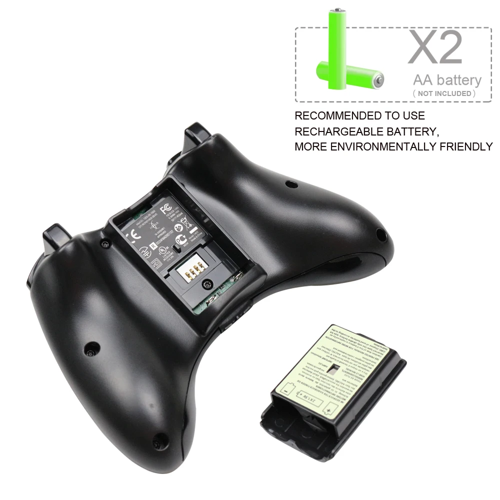 Para el controlador inalámbrico xbox 360 2,4G, cames con receptor de 2,4G, para que puedas conectarlo a xbox 360/PC de forma inalámbrica. También tiene una doble vibración incorporada, necesita 2 pilas AA (no incluidas) y sin conector de auriculares.