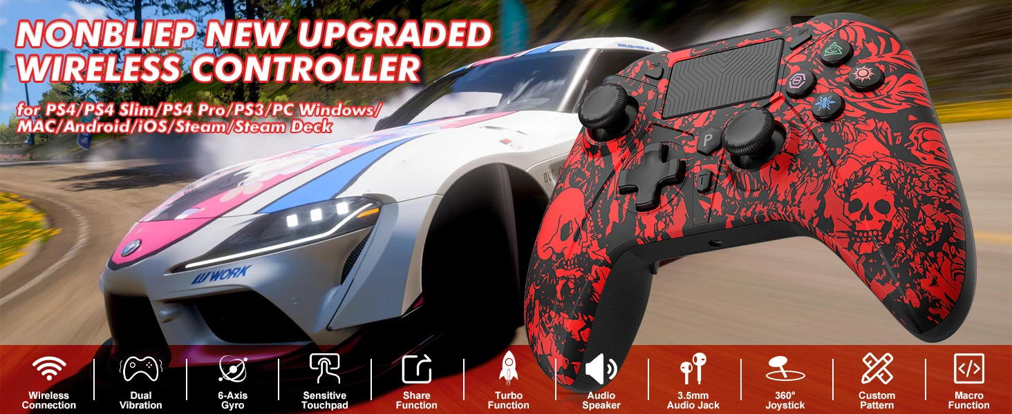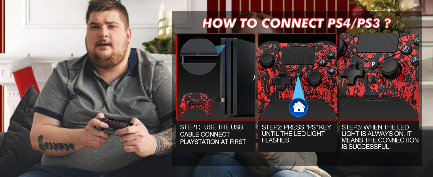【Amplia compatibilidad】: el controlador inalámbrico para PS4 es compatible con la mayoría de las plataformas como PS4/Pro/Slim/PC (algunos juegos de PS4 en PS5).Nota: Active el dispositivo con un cable USB para la primera conexión coincidente.