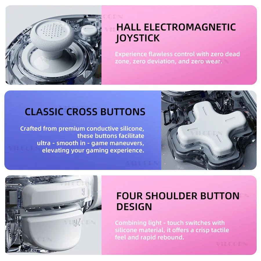 Joystick electromagnético Hall para un control preciso; Botones cruzados clásicos para un funcionamiento suave; Cuatro botones de hombro con tacto nítido y respuesta rápida.