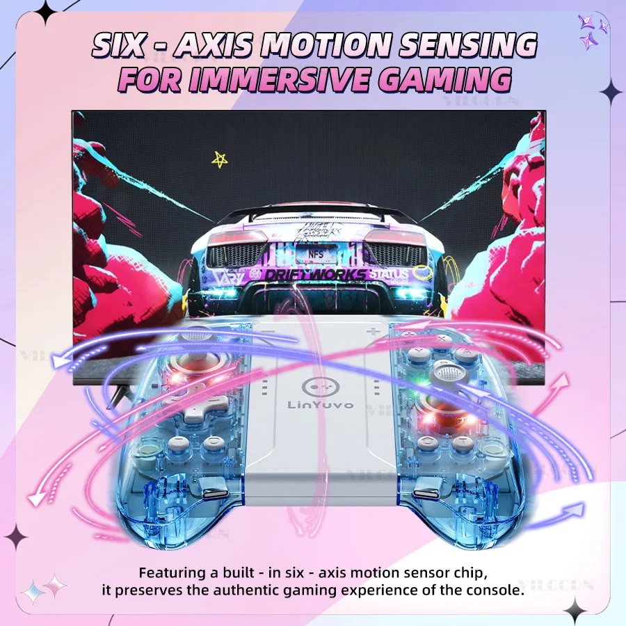 Detección de movimiento de seis ejes para juegos inmersivos.El chip sensor incorporado garantiza una experiencia de consola auténtica con un control preciso.