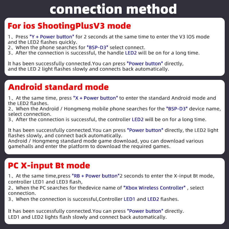 NOTA: para jugar al juego 'Call of Duty Mobile', 'Apex Legends' y 'Honkai Impact3', inicies el controlador presionando la tecla 'RB+Home', y el nombre de Blutooth es 'Xbox Wireless Controller'.