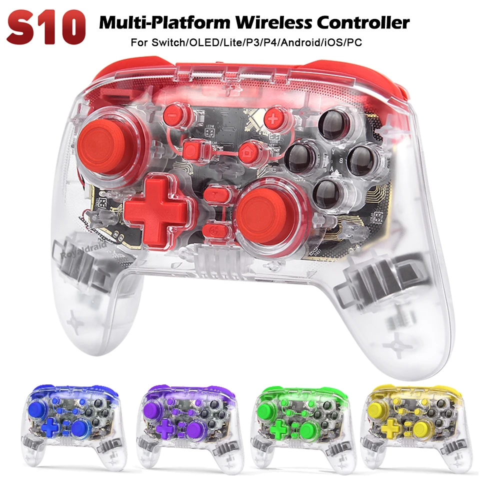 Gamepad multiplataforma S10 para Switch/OLED controlador inalámbrico BT para P3/P4/PC controlador de Juego 6 ejes joysticks de juego transparentesCaracterísticas:1. Tres modos de conexión:El controlador de juego para Switch Pro admite modos de conexión inalámbrica con cable, compatible con Bluetooth y 2,4G que se pueden cambiar fácilmente.