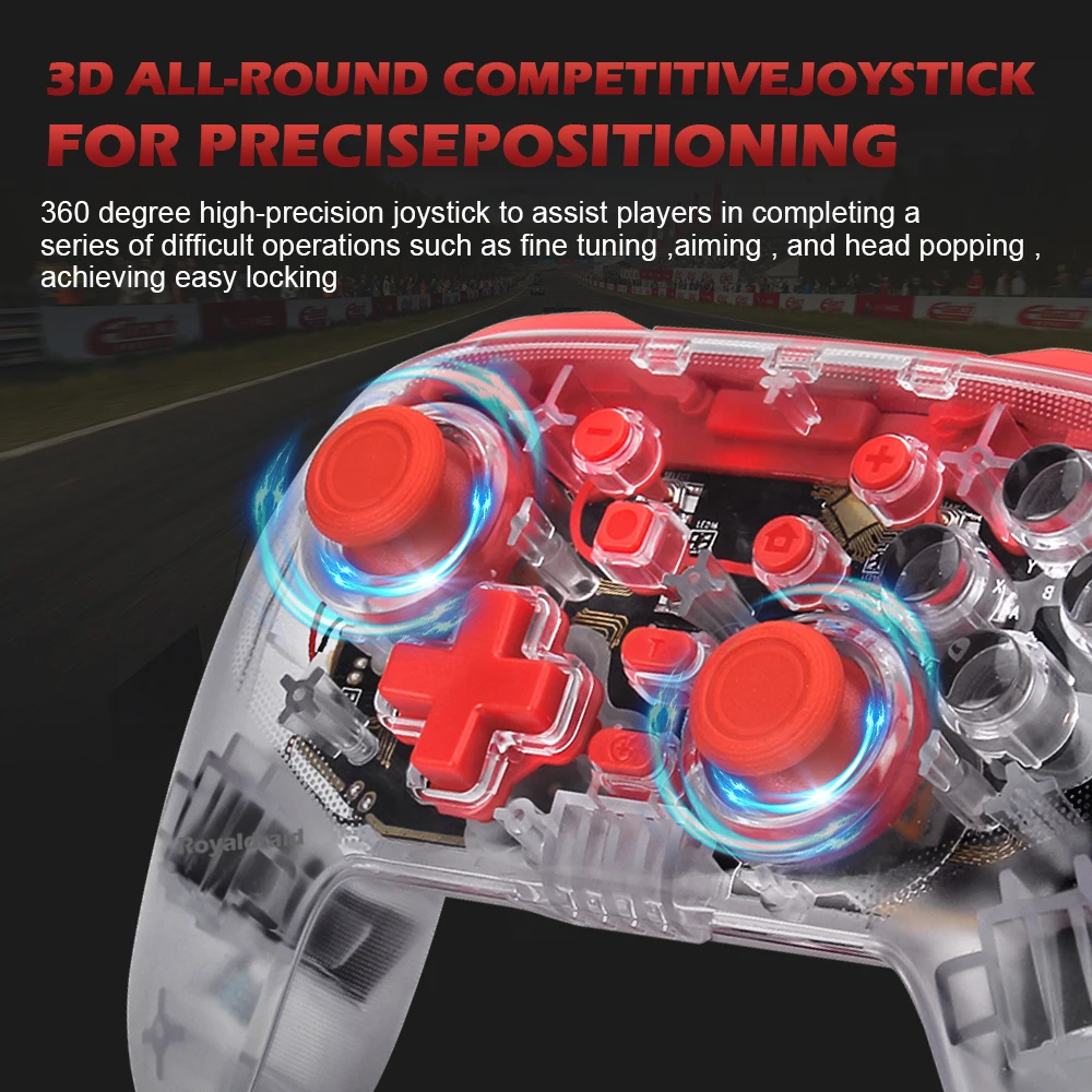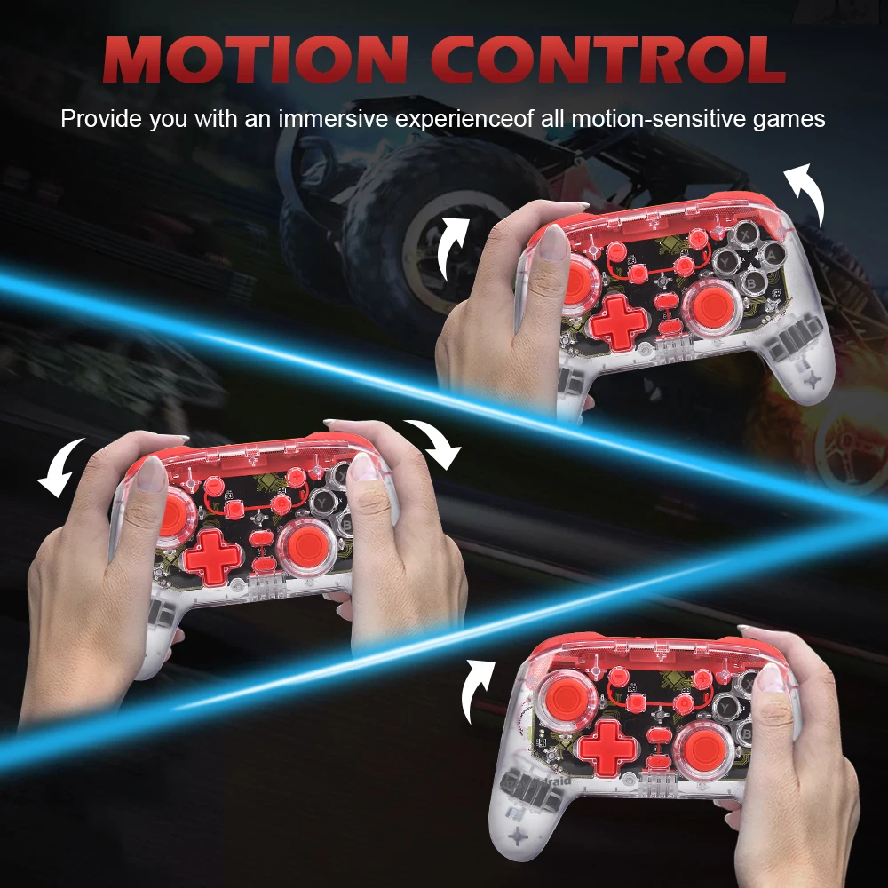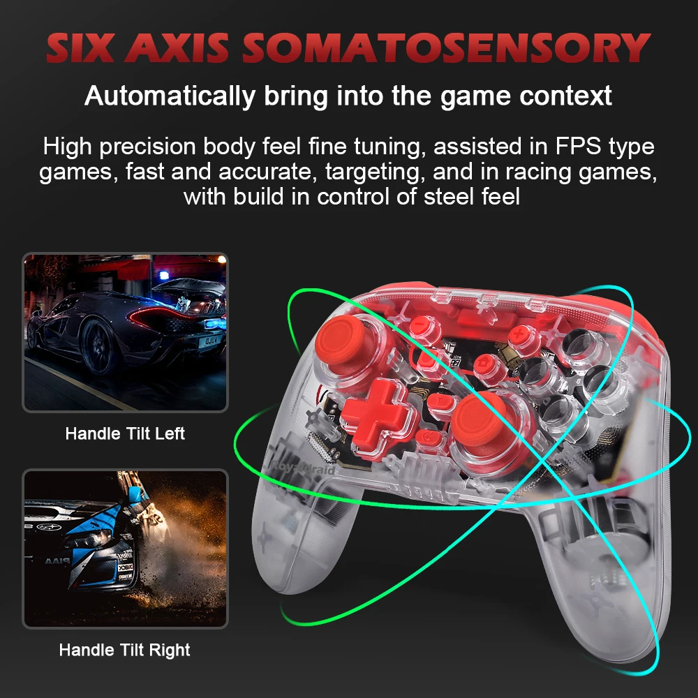 3. Función de detección corporal SixAxis:Este GamePad transparente tiene una función de detección corporal de seis ejes de alta precisión que se adapta automáticamente al entorno del juego y proporciona precisión y control mejorados. Es especialmente útil en FPS y juegos de carreras.