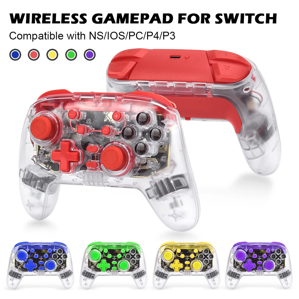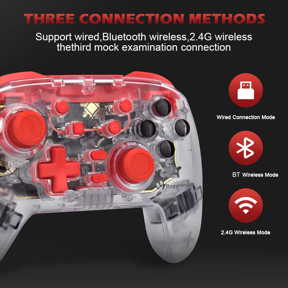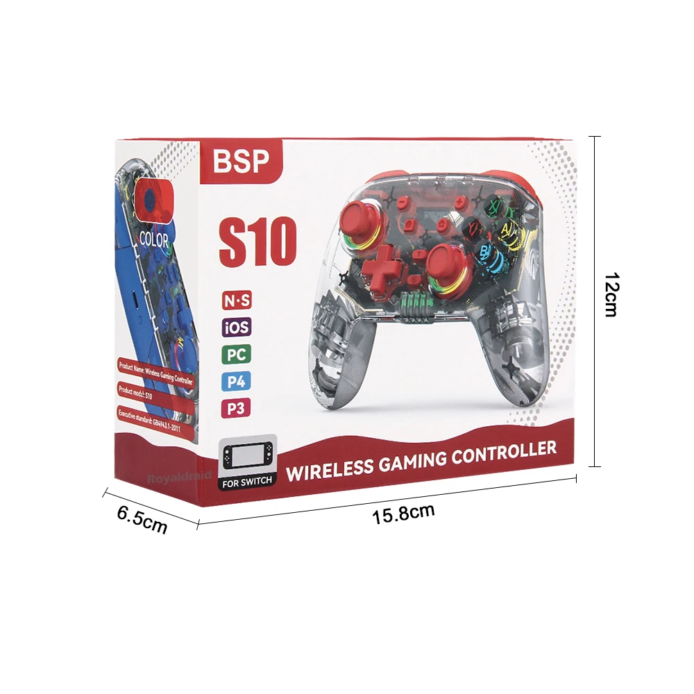 Gamepad multiplataforma S10 para Switch/OLED controlador inalámbrico BT para P3/P4/PC controlador de Juego 6 ejes joysticks de juego transparentesCaracterísticas:1. Tres modos de conexión:El controlador de juego para Switch Pro admite modos de conexión inalámbrica con cable, compatible con Bluetooth y 2,4G que se pueden cambiar fácilmente.