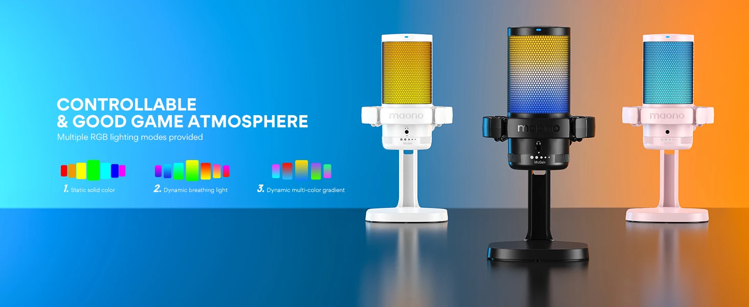 STUNNING RGB LIGHTING - This PC gaming microphone boasts stunning RGB lighting, with dynamic multicolor, breathing light, or static solid color modes. This helps to create an immersive gaming experience and adds an extra layer of visual appeal to your gaming setup. The RGB lighting can choose to suit your preferences, helping you to set the tone for gameplay and create an exciting atmosphere. It enhances your gaming performance, whether you're playing solo or competing with others online.