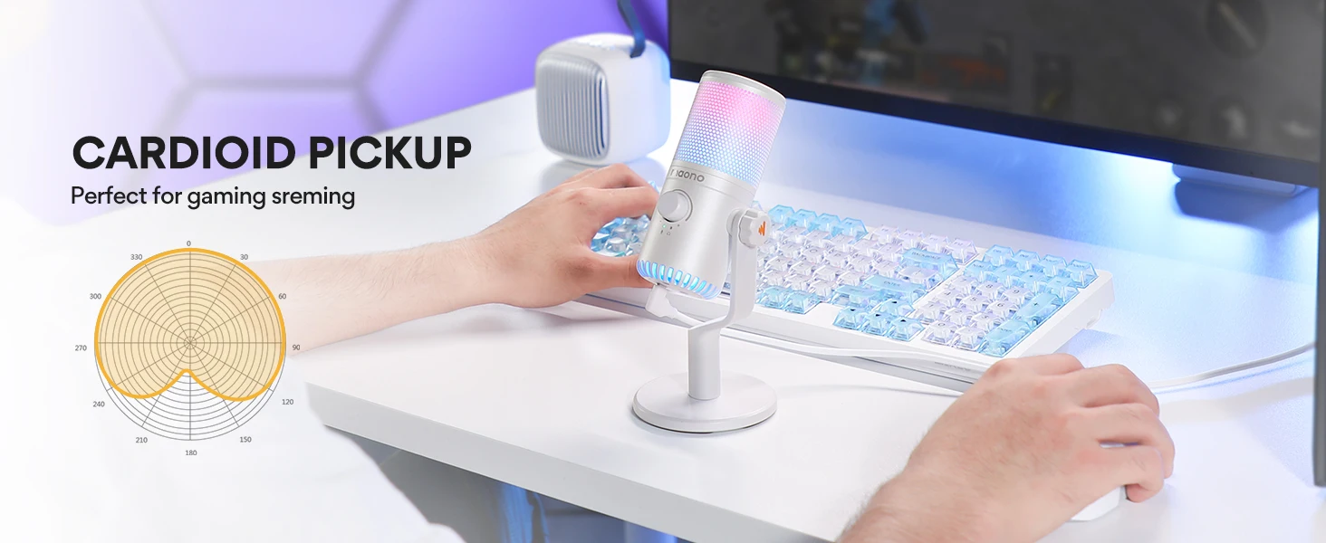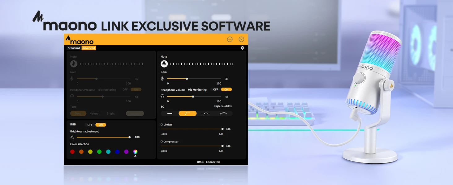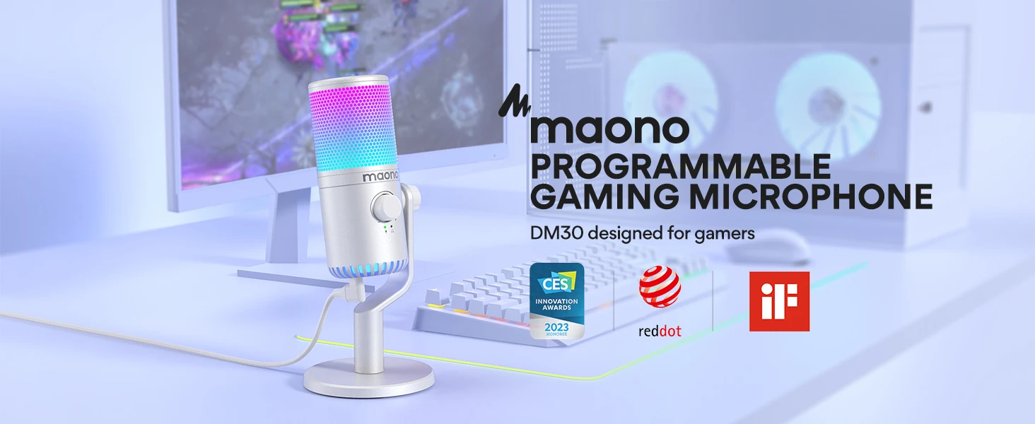 DM30 RGB ganó el premio CES Innovation Award, IF y Red Dot en 2023.El patrón de captación cardioide rechaza el ruido fuera del eje, minimizando el tono de la habitación incluso cuando habla directamente al micrófono.Utilice una combinación de EQ, limitador y compresor en el enlace MAONO para personalizar su voz, transmite su voz alta y clara.