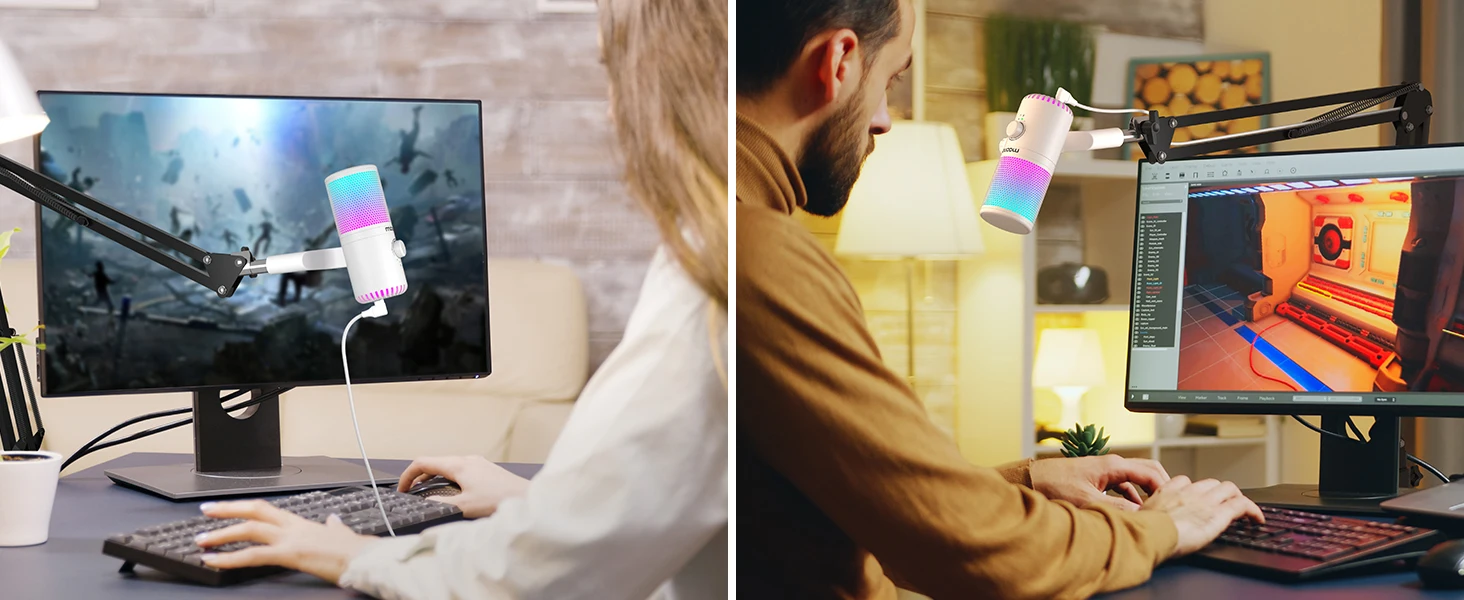 El micrófono para juegos tiene impresionantes gradientes multicolores dinámicos y 7 efectos degradados dinámicos de colores sólidos. Su estilo personalizable hará que el video de su juego o la transmisión en vivo atraigan a más espectadores.Perfecto para juegos y transmisiones en YouTube, Twitch, Facebook, Instagram, Discord y otras plataformas similares.