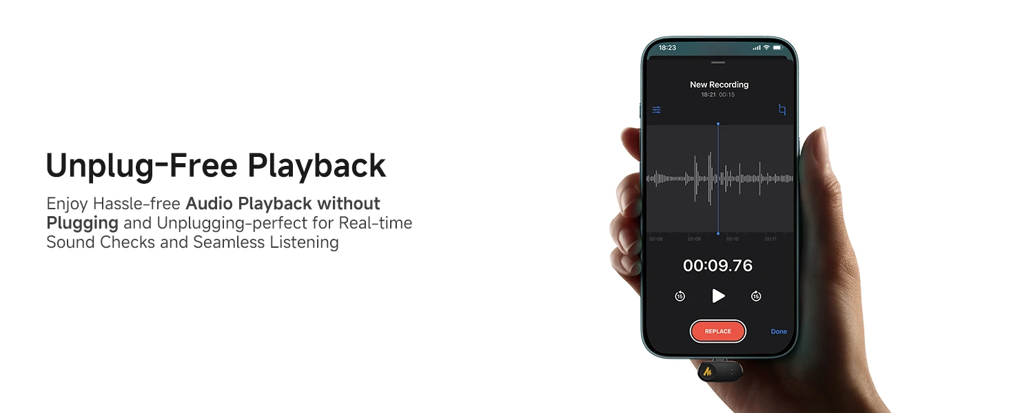 El receptor cuenta con un puerto USB-C incorporado, lo que elimina la necesidad de cables divisores adicionales. Con la capacidad de cargar su teléfono mientras graba, puede transmitir y comunicarse sin preocuparse por quedarse sin batería.