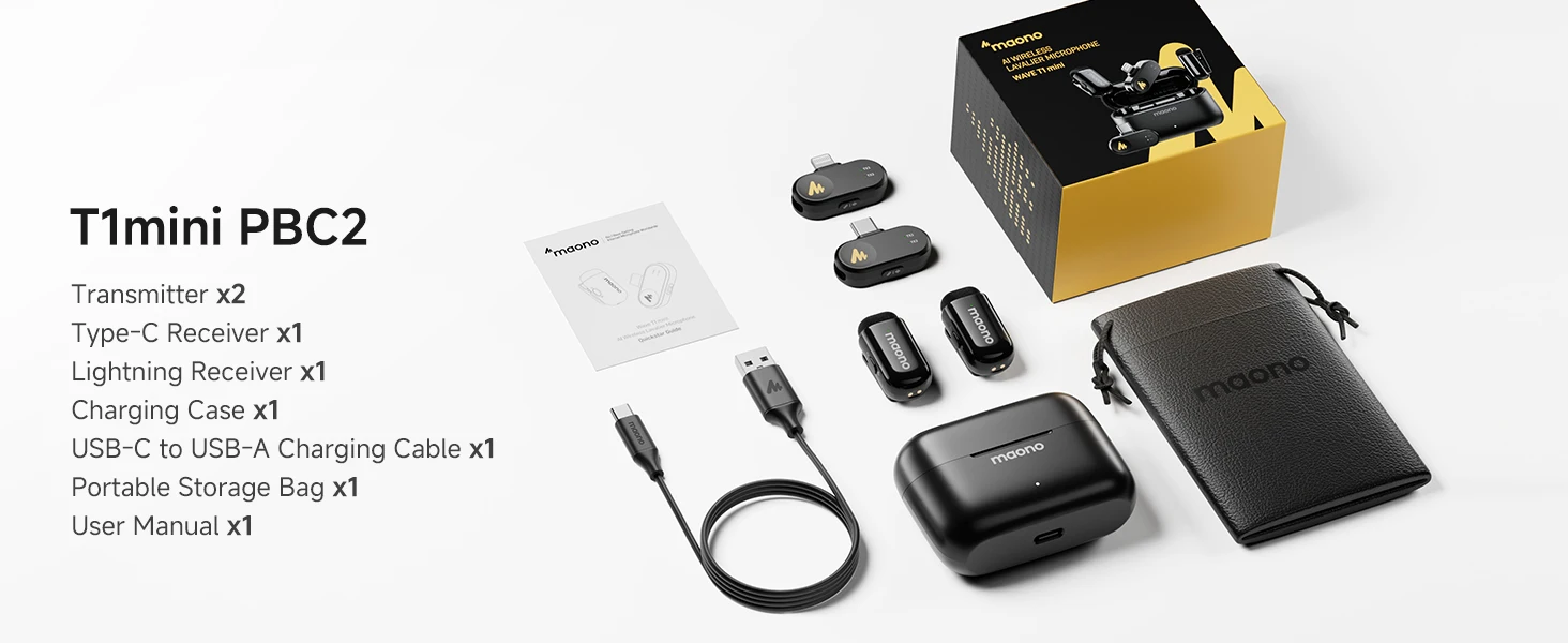 MAONO T1mini micrófono inalámbrico de solapa para teléfono con cancelación de ruido función de recorte automático ajuste de aplicación micrófono de grabación de Audio y vídeo