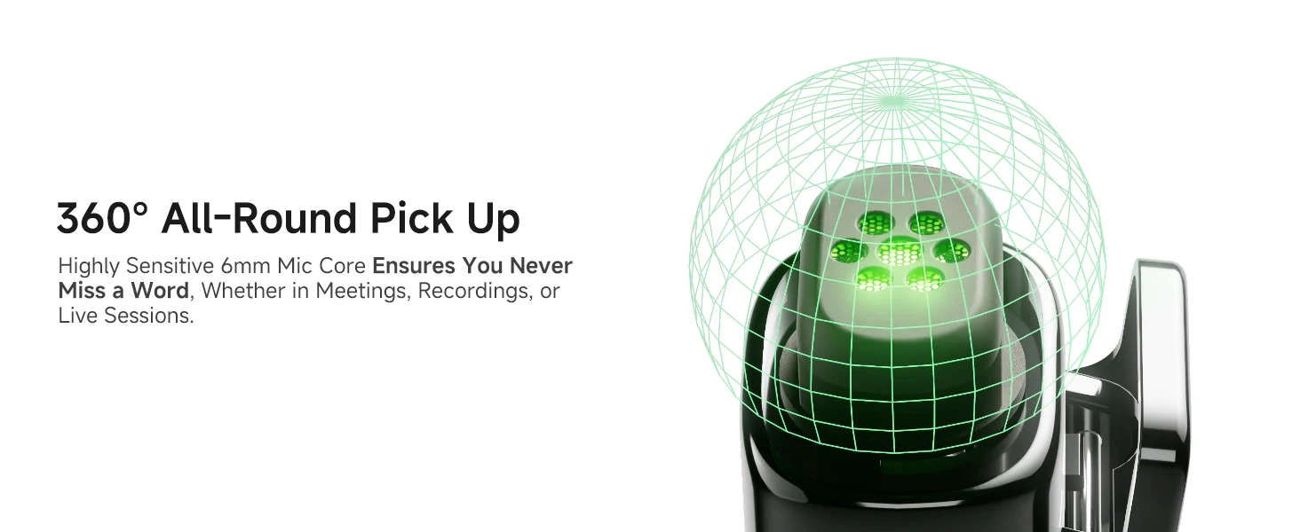 Equipado con un micrófono de condensador premium de 6 mm, ofrece grabación omnidireccional completa, lo que garantiza que se capture cada detalle desde todos los ángulos.Perfecto para experiencias de audio envolventes, sin importar dónde se origina el sonido.