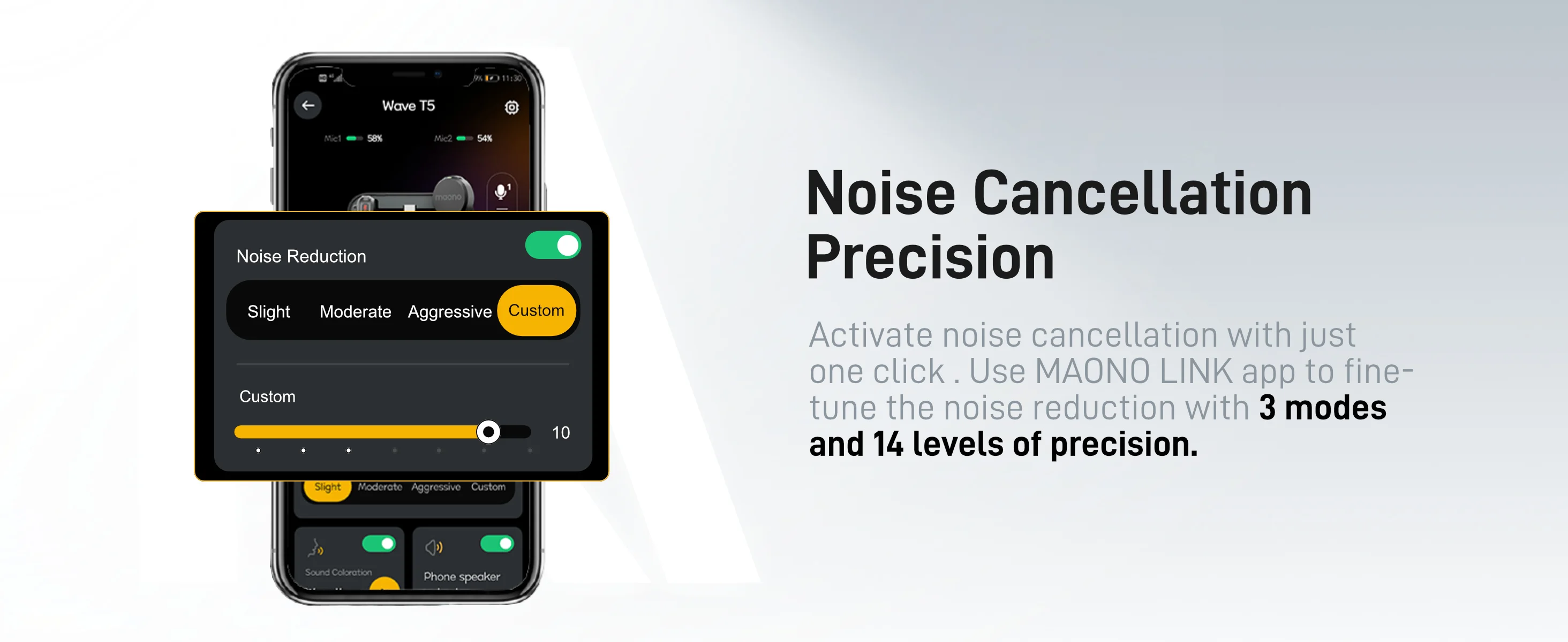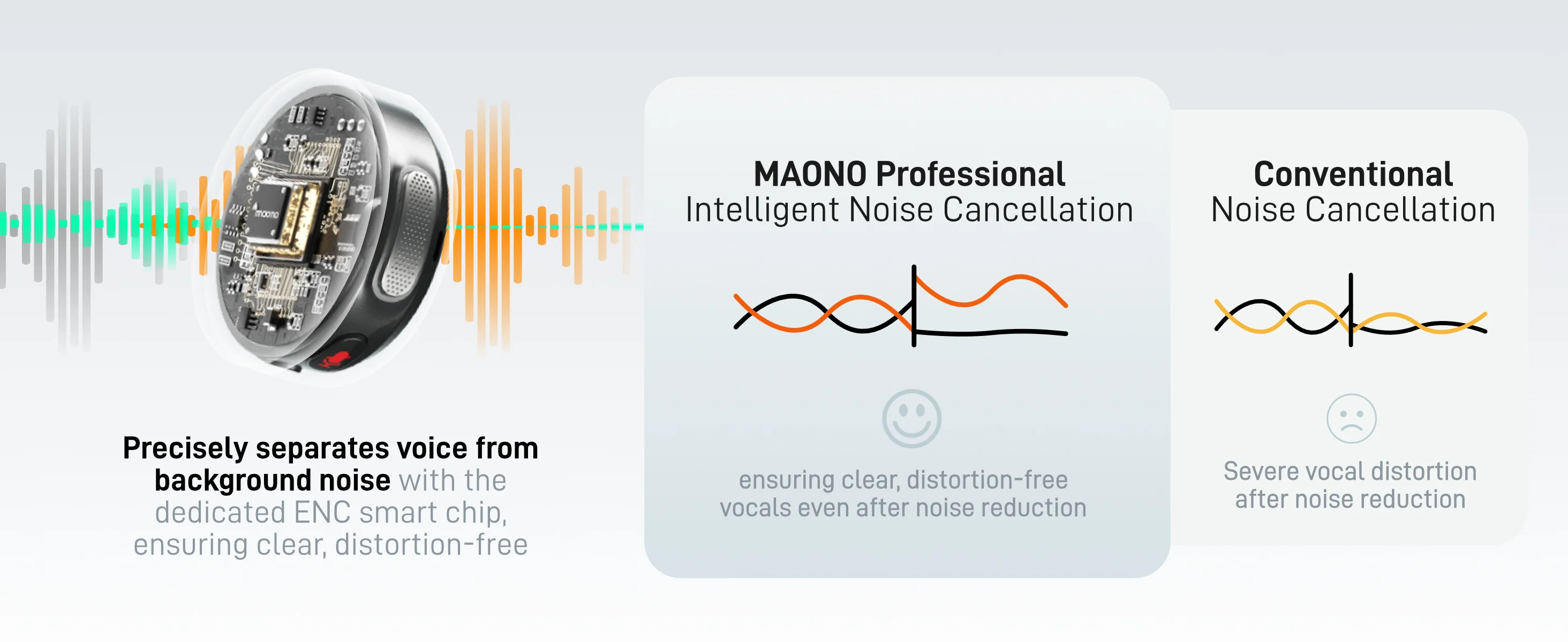 Cancelación de ruido inteligente de nivel profesional: el chip y el algoritmo ENC dedicados separan con precisión la voz del ruido, lo que garantiza un sonido claro y sin distorsiones.Elija entre ajuste de cancelación de ruido de 3 modos/14 niveles a través de la aplicación MAONO LINK, que satisface fácilmente todas sus necesidades