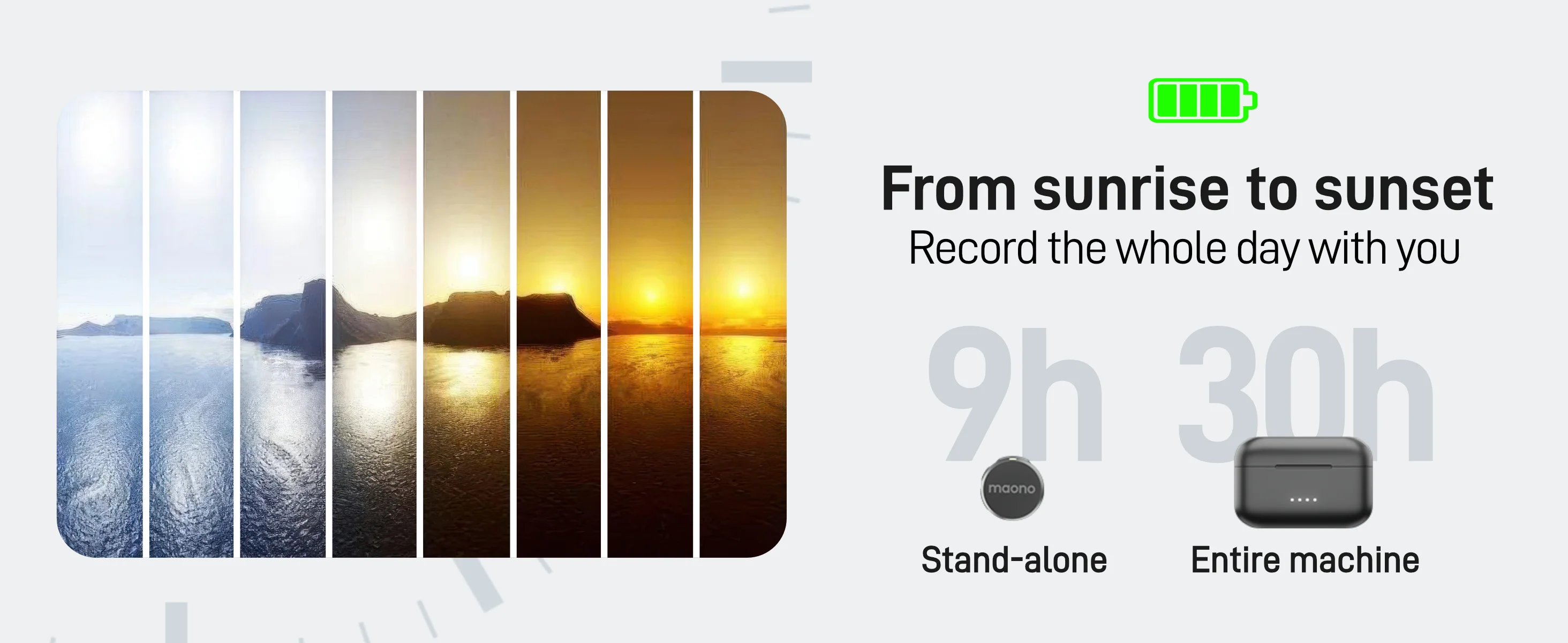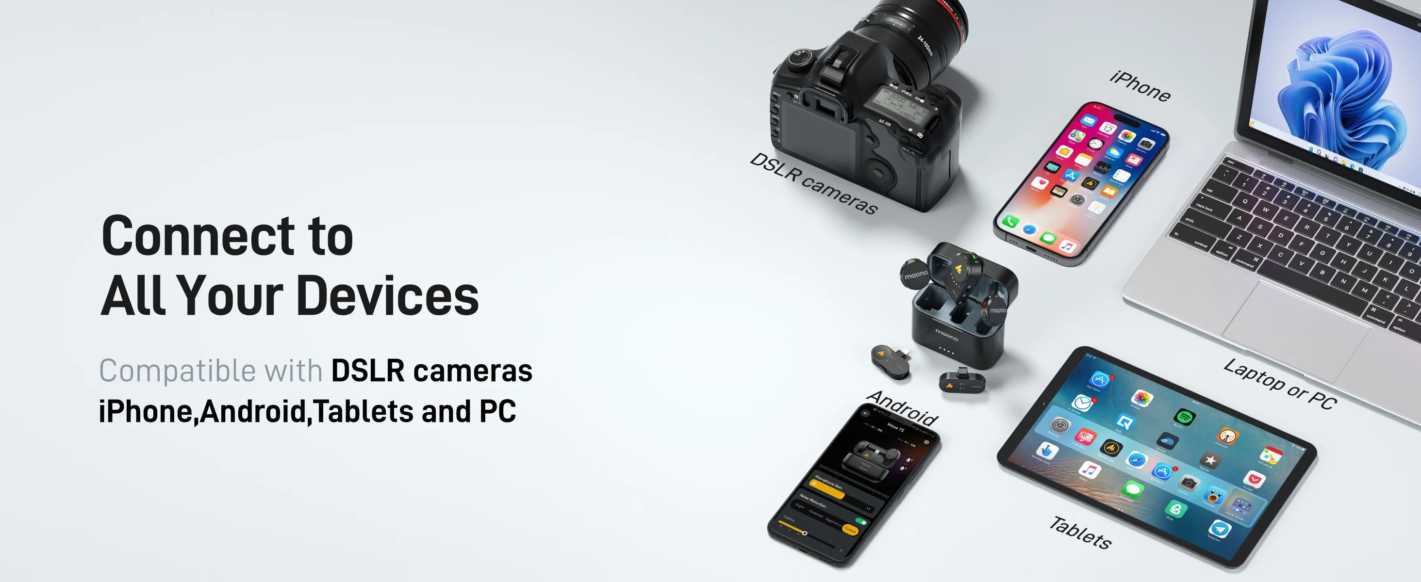Duración extendida de la batería de 30 horas: disfrute de hasta 9 horas de duración de la batería por transmisor, 30 horas con un estuche de carga compacto.Wave T5 también permite cargar el teléfono mientras graba, lo que garantiza un uso continuo durante viajes largos, entrevistas, transmisión en vivo y otros escenarios de uso intensivo.