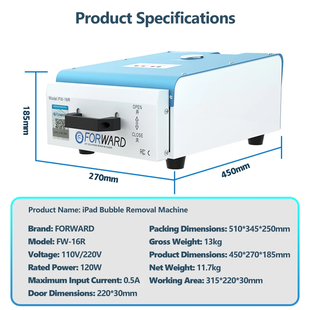FORWARD FW-16R Máquina de eliminación de burbujas de pantalla grande para teléfonos móviles IPad Tablets Dispositivo Herramienta de eliminación de burbujas de reparación de pantalla