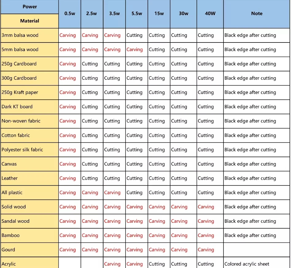 El láser de 1,5500 mW es una lente ajustable para el enfoque, la longitud de enfoque adecuada es de 6 a 7 cm, puede grabar en madera, madera contrachapada, bambú, cuero, acrílico negro, plástico, rubberm, etc.También puede cortar tableros de carbono y tableros de madera de aproximadamente 2 mm;