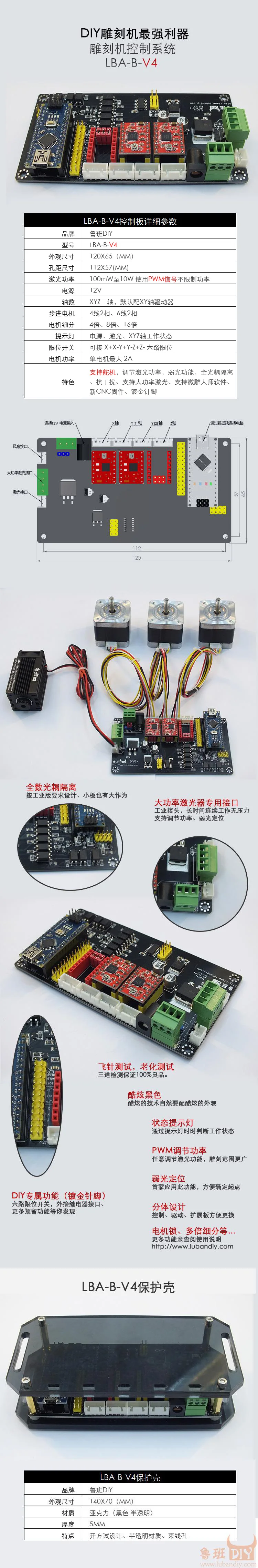 Modelo: LAB-B-V4Tamaño de la apariencia: 12/65 (MM)Tamaño del paso: 112/57 (MM)Potencia del láser: 100MW a 5WFuente de alimentación: 12VNúmero de ejes: XYZ tres ejesMotor paso a paso: 4 hilos bifásico; 6 hilos bifásicoDesglose del motor: 4 veces; 8 veces; 16 vecesLuces de punta: potencia; láser; condición de trabajo del eje XYZInterruptor de límite: X + 2 + 1 + 2 + Z-Límite de seis vías (no coincide el valor predeterminado).Potencia del motor: motor único máximo 2ACaracterísticas: ajustar la potencia del láser; función de luz baja, todo el aislamiento óptico, anti-interferencias, soporte para láser de alta potencia; soporte gurú del software de micro-grabado; toda la red el último firmware cncEl paquete incluye1 tablero CNC(La Carcasa protectora no está incluida en el paquete, si es necesario, póngase en contacto con el vendedor)