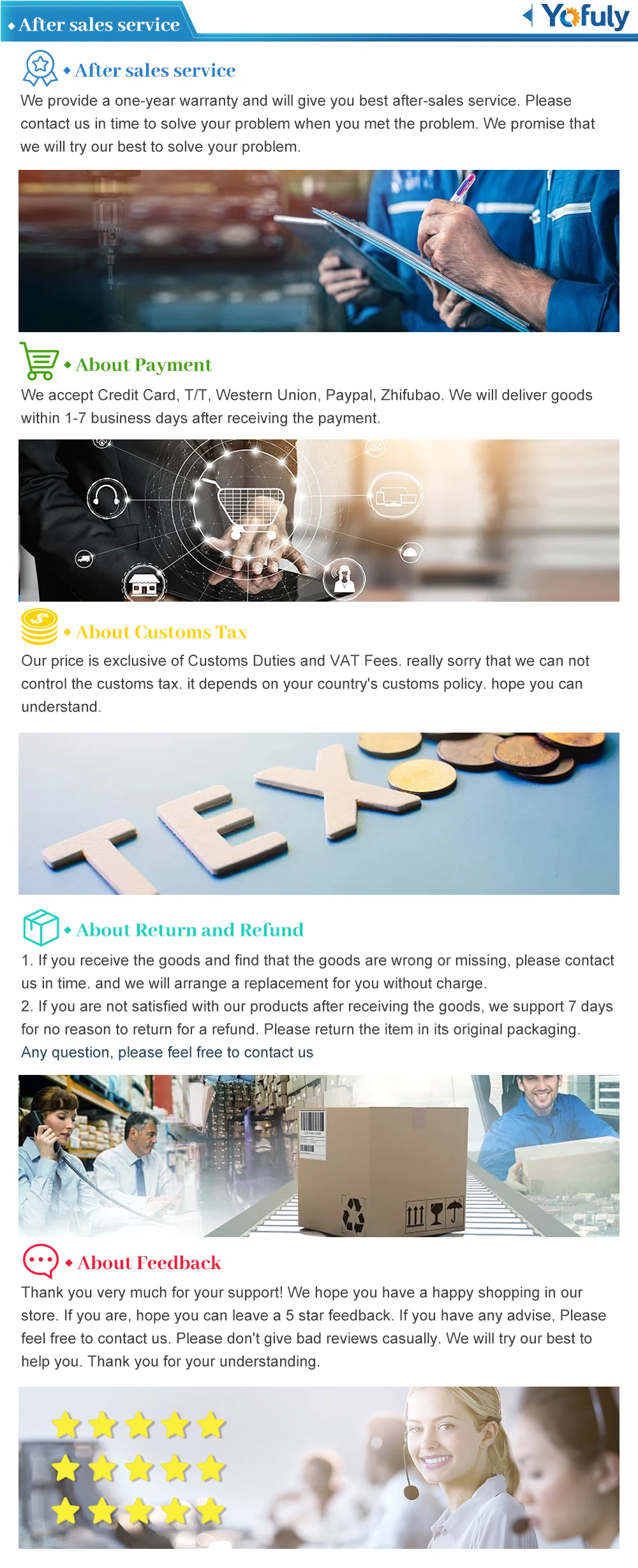¡Proporcionaremos 1 año de garantía y resolveremos todos sus problemas postventa! Comprobaremos todos los productos antes de enviarlos, ¡nos aseguramos de que reciba productos de alta calidad! Pero si tiene algún consejo, no dude en contactarnos. Por favor, no dé malas críticas casualmente.