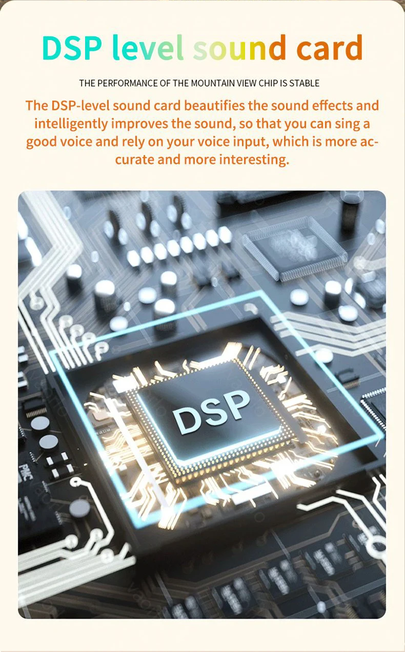 ● Sonido envolvente estéreo HIFI, recupera la experiencia del karaoke, la tarjeta de sonido de nivel DSP embellece los efectos de sonido y mejora el sonido de manera inteligente, para que pueda cantar una buena voz y hacer que su voz sea más realista, hermosa e interesante.