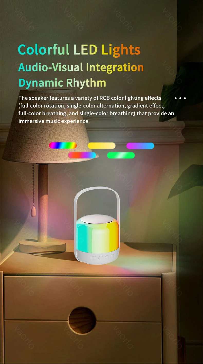 ● El altavoz presenta una variedad de efectos de iluminación de color RGB (rotación a todo color, alternancia de un solo color, efecto de gradiente, respiración a todo color y respiración de un solo color) que proporcionan una experiencia musical inmersiva.