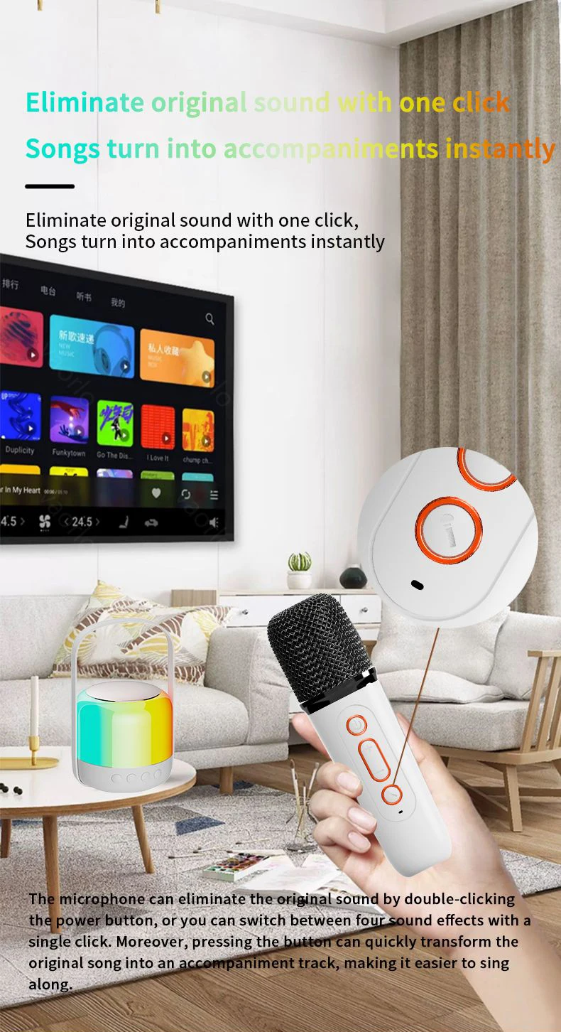 ● El micrófono puede eliminar el sonido original haciendo doble clic en el botón de encendido, o puede cambiar entre cuatro efectos de sonido con un solo clic. Además, presionar el botón puede transformar rápidamente la canción original en una pista de acompañamiento, lo que facilita cantar.