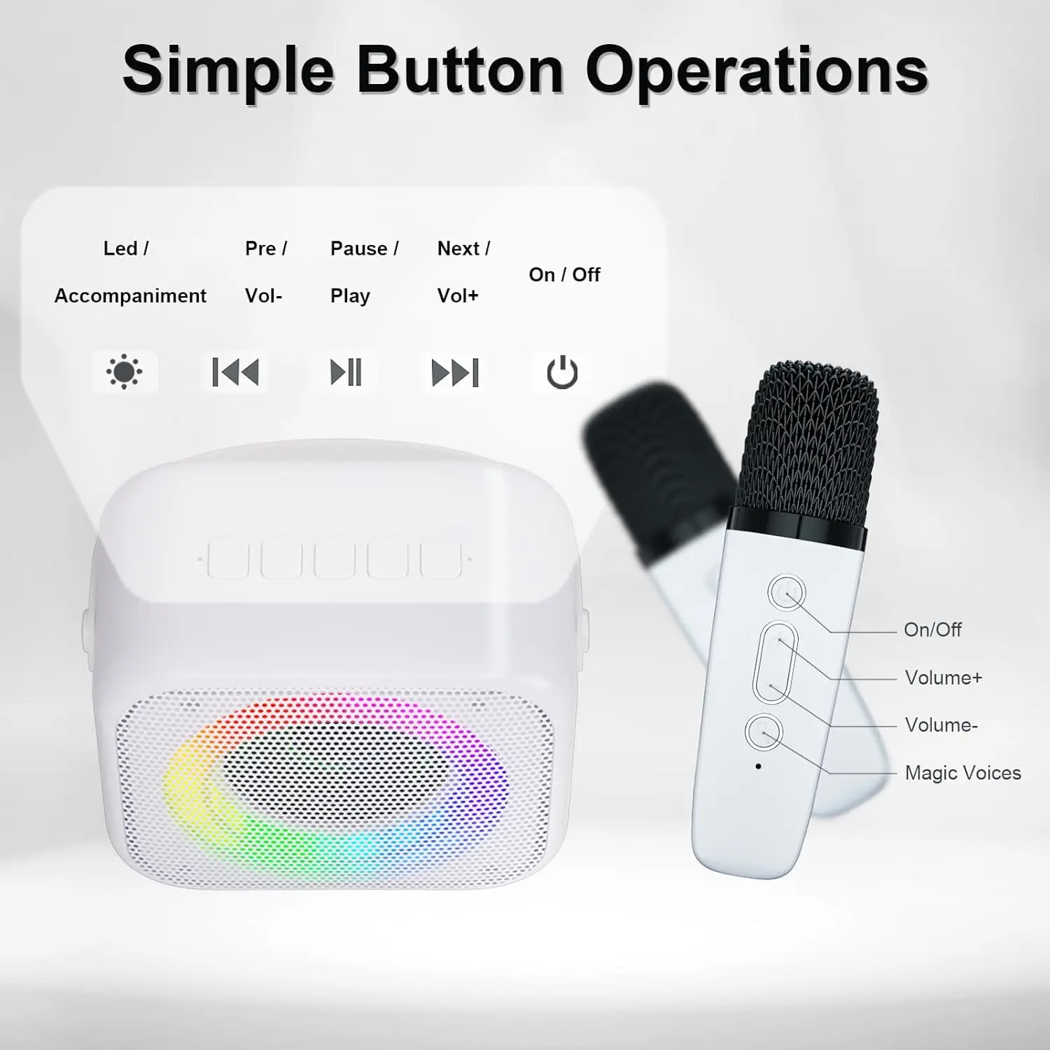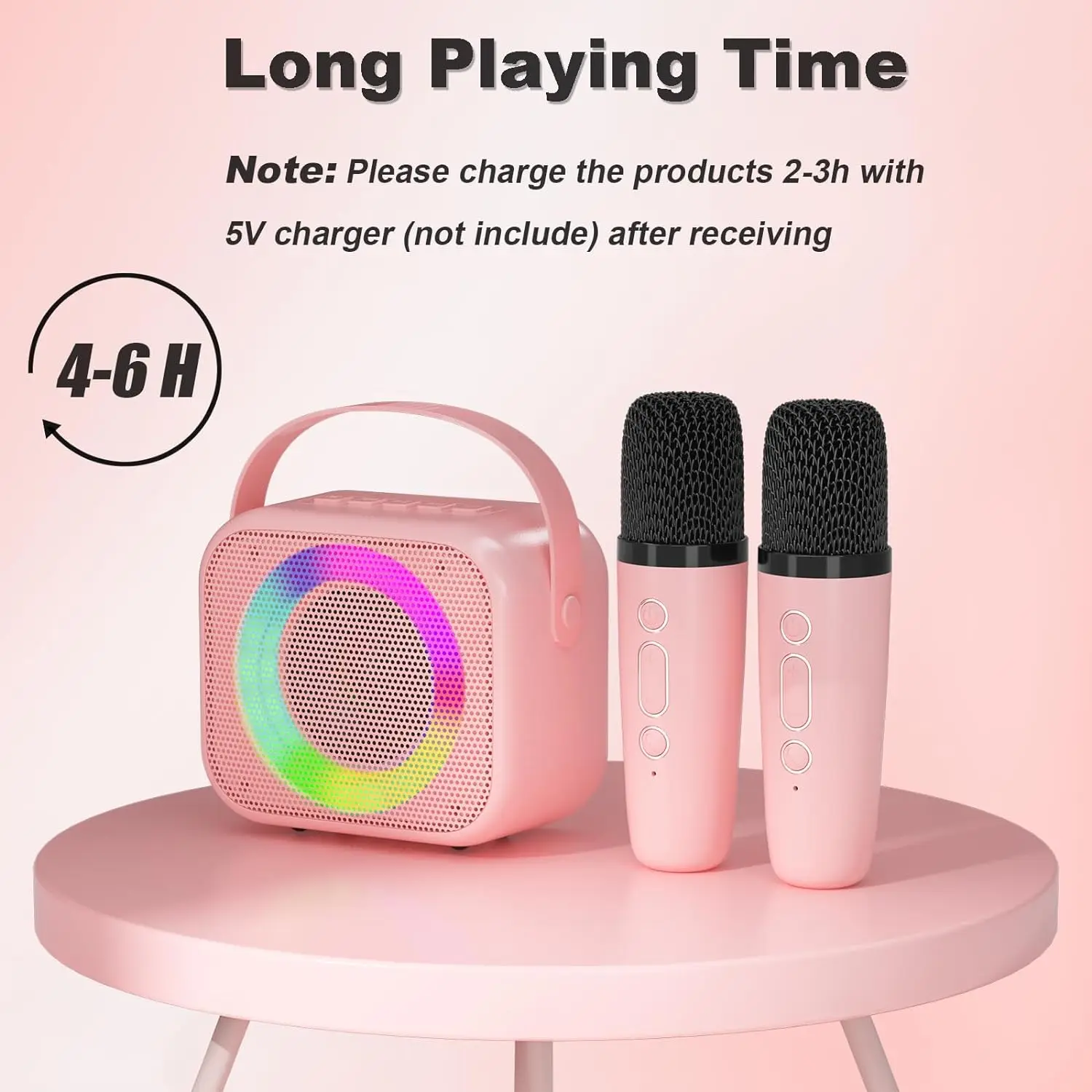 ♪【 2 micrófonos inalámbricos】 La máquina de karaoke para niños con 2 micrófonos recargables, durará 5-6h después de cargarse completamente. La operación más fácil y el peso ligero son adecuados para los niños. Después de encender los micrófonos y el altavoz, se conectarán automáticamente.