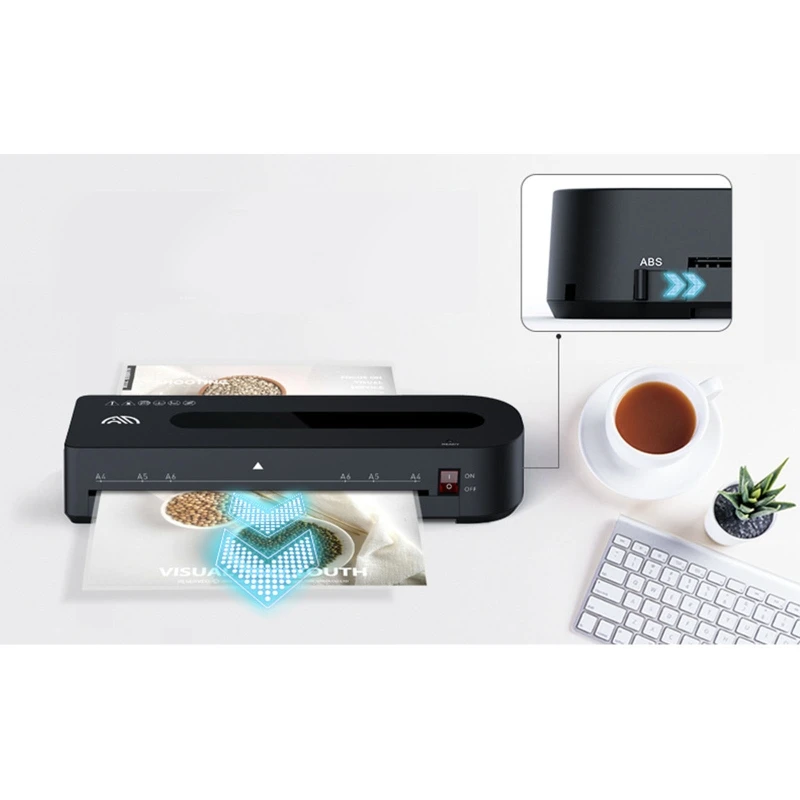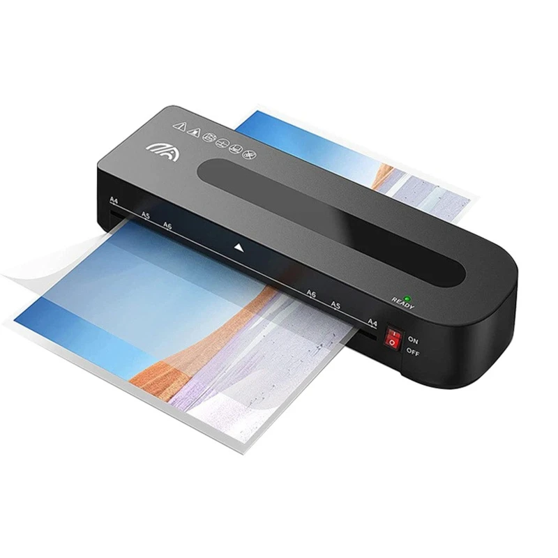 La máquina laminadora es de tamaño A4 de ancho y puede usar bolsas térmicas de 3-5 mils de espesor, de hasta 9 pulgadas de ancho; la temperatura máxima de trabajo es de 125 ℃, y el sistema de apagado automático puede evitar el sobrecalentamiento.
